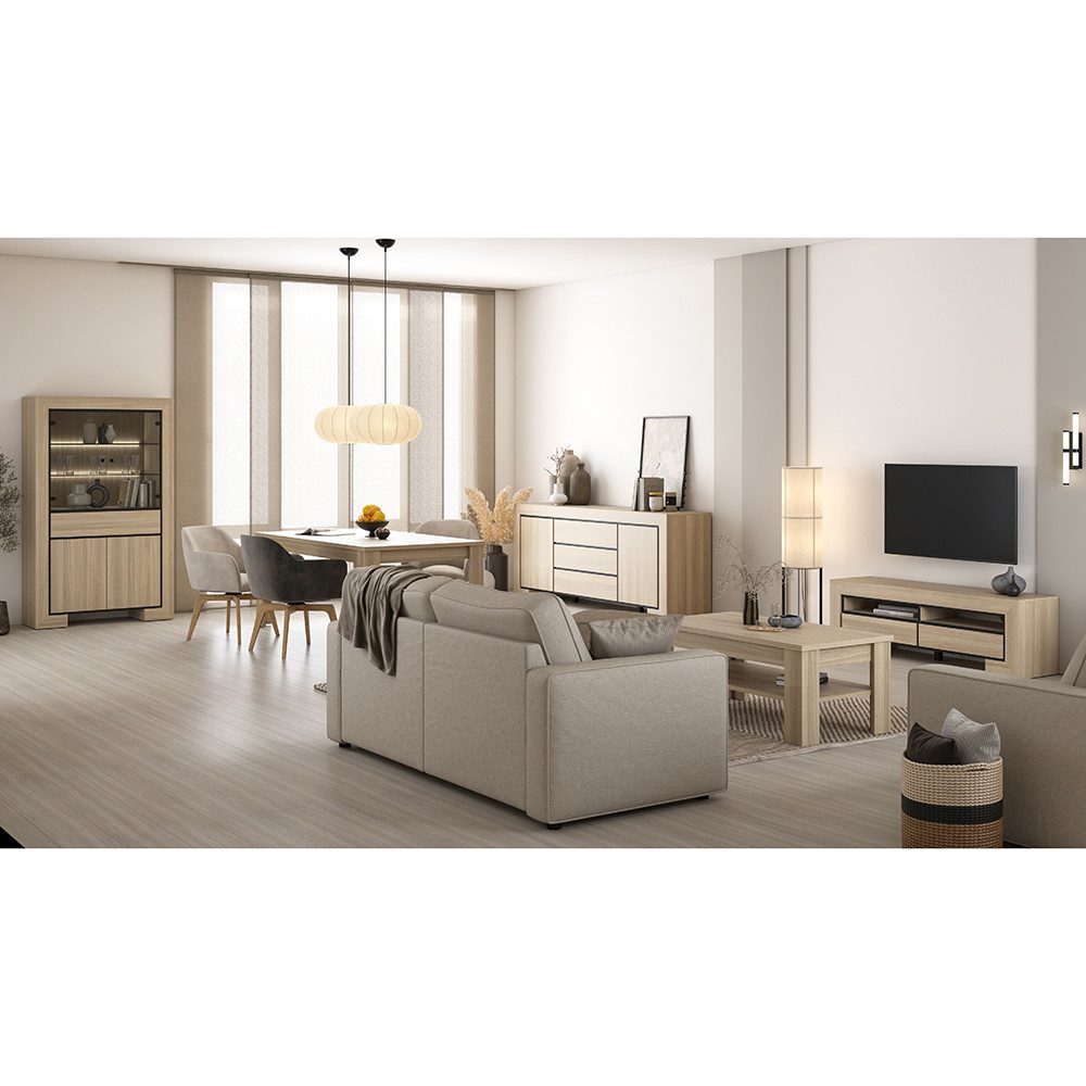 Das warme Eiche-Dekor strahlt Behaglichkeit aus, während schwarze Akzentlinien und Sicherheitsglas moderne Akzente setzen. Die Vitrine inszeniert deine Lieblingsstücke mit LED-Beleuchtung, Sideboard und Lowboard bieten großzügigen Stauraum, und Esstisch sowie Couchtisch schaffen gesellige Treffpunkte. Grifflose Fronten mit abgeschrägter Kante und Softclose-Technik sorgen für Komfort im Alltag – für ein Zuhause, das Stil und Funktion perfekt verbindet.