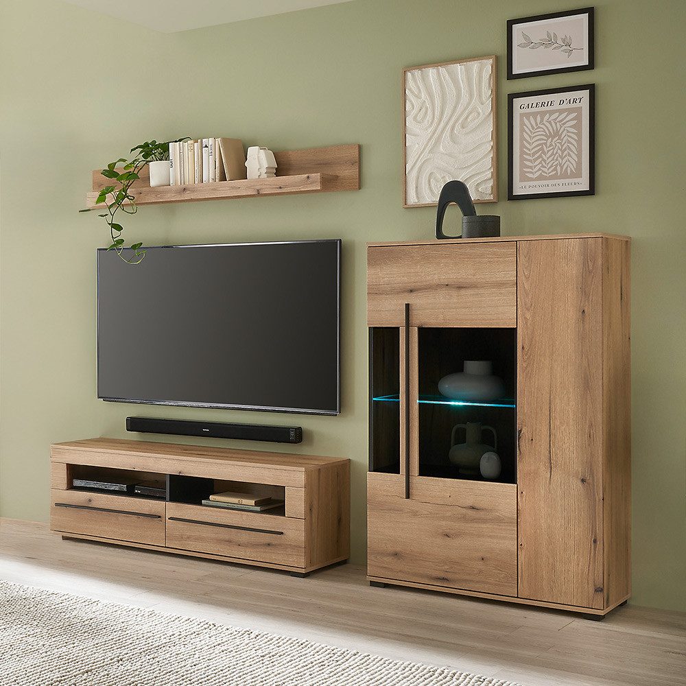 Dieses Set bringt genau das Gefühl in dein Wohnzimmer, nach dem man sich am Ende eines Tages sehnt: Ruhe, Struktur und ein Hauch von Stil. Die Vitrine mit LED-beleuchteten Glasböden setzt deine liebsten Stücke gekonnt in Szene, das Lowboard bringt Technik ordentlich unter und das Wandboard bietet Platz für schöne Akzente. Die Kombination aus warmer Eicheoptik und modernen Details macht das Set zu einem echten Lieblingsort. Einrichten, losleben – und einfach wohlfühlen.