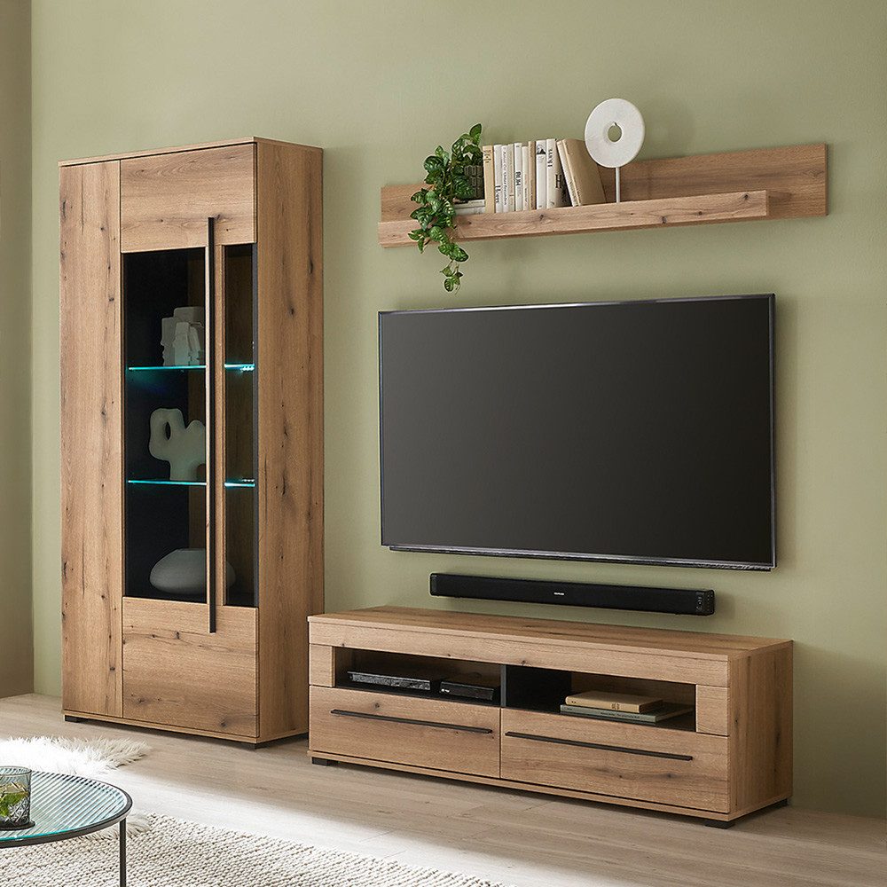 Dieses Set bringt genau die richtige Mischung aus Wohnlichkeit und Klarheit in dein Zuhause. Die Vitrine mit beleuchteten Glasböden setzt deine Lieblingsstücke gekonnt in Szene. Das TV-Lowboard sorgt für Ordnung rund um Fernseher und Technik, ohne sich in den Vordergrund zu drängen. Und das Wandboard ergänzt das Ensemble leicht und dekorativ. Die warme Eicheoptik schafft sofort ein wohnliches Gefühl – ein Set, das nicht überladen ist, sondern dir einfach den Raum gibt, den du brauchst.