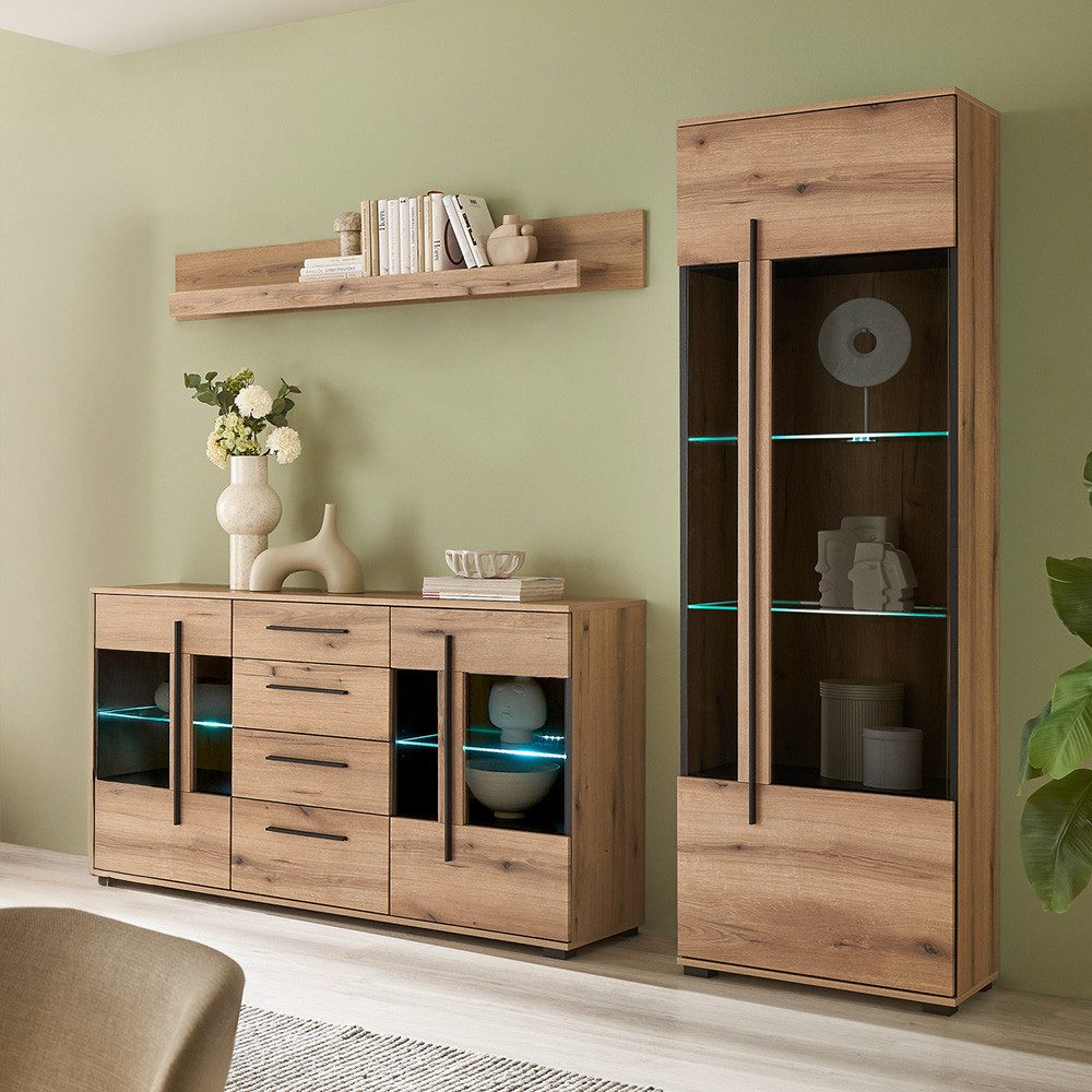Dieses Set bringt Ordnung und Stil perfekt zusammen. Die Vitrine mit LED-beleuchteten Glasböden setzt deine schönsten Stücke ins rechte Licht, während die Kommode jede Menge Stauraum für Alltagsdinge bietet. Das passende Wandboard rundet das Set harmonisch ab und schafft zusätzliche Fläche für Deko oder Bücher. Die Kombination aus natürlicher Eicheoptik und modernen Kontrasten macht diesen Dreiklang zur idealen Wahl für ein Wohnzimmer, das modern wirkt und trotzdem warm und einladend bleibt.