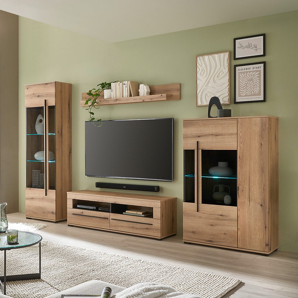 Dieses Set verleiht deinem Wohnzimmer eine Atmosphäre, die modern wirkt und trotzdem gemütlich bleibt. Die Kombination aus Eicheoptik, Glasdetails und stimmungsvoller Beleuchtung macht sofort Eindruck. Die Vitrinen setzen deine liebsten Stücke ins rechte Licht, das Lowboard bringt Technik und Ordnung unter, und das Sideboard schafft Platz für alles, was du verstauen möchtest. Wenn du ein Wohnambiente willst, das Stil und Funktion vereint, triffst du mit diesem Set garantiert die richtige Wahl.