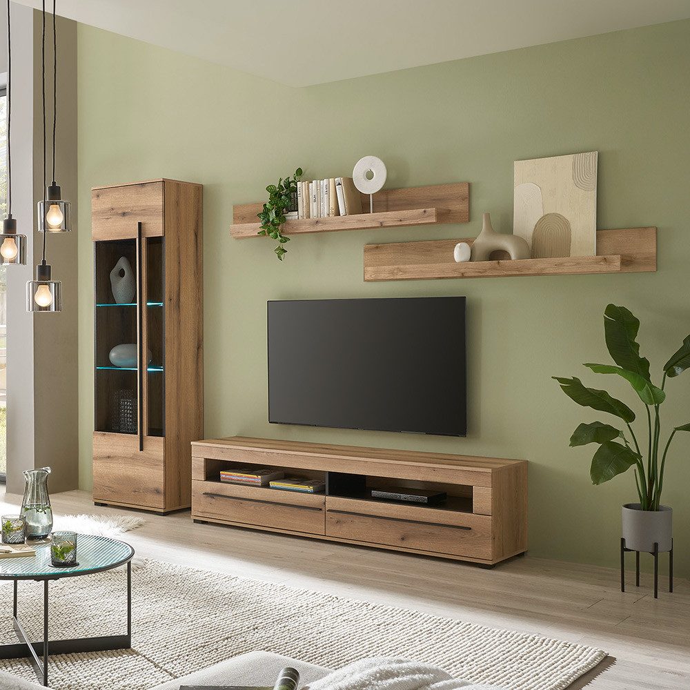 Dieses Set bringt moderne Wohnlichkeit ganz ohne Schnörkel in dein Zuhause. Die Kombination aus warmem Holzton, reduzierter Formensprache und gezielt gesetzter Beleuchtung sorgt für eine entspannte Atmosphäre. Die Vitrine bietet Platz für schöne Lieblingsstücke, das Lowboard nimmt Technik dezent auf, und die Wandboards setzen stilvolle Akzente. Ideal, wenn du Wert auf Design legst, aber nicht auf Gemütlichkeit verzichten willst. Перейти und Wohnzimmer neu erleben.