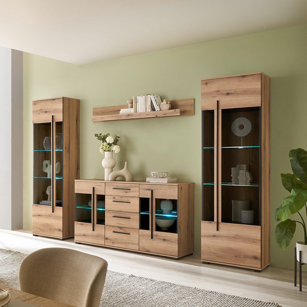 Dieses Set bringt deine Lieblingsstücke groß raus. Zwei hohe Vitrinen mit beleuchteten Glasböden sorgen für stilvolle Präsentation, die Kommode in der Mitte bietet jede Menge Stauraum für alles, was du gerne aufgeräumt hast. Mit dem passenden Wandboard für Bücher oder Dekoration wird daraus ein stimmiges Gesamtbild. Die Eicheoptik strahlt Wärme aus, während schwarze Akzente einen modernen Look schaffen. Perfekt für alle, die ihr Wohnzimmer stilvoll und trotzdem gemütlich einrichten möchten.