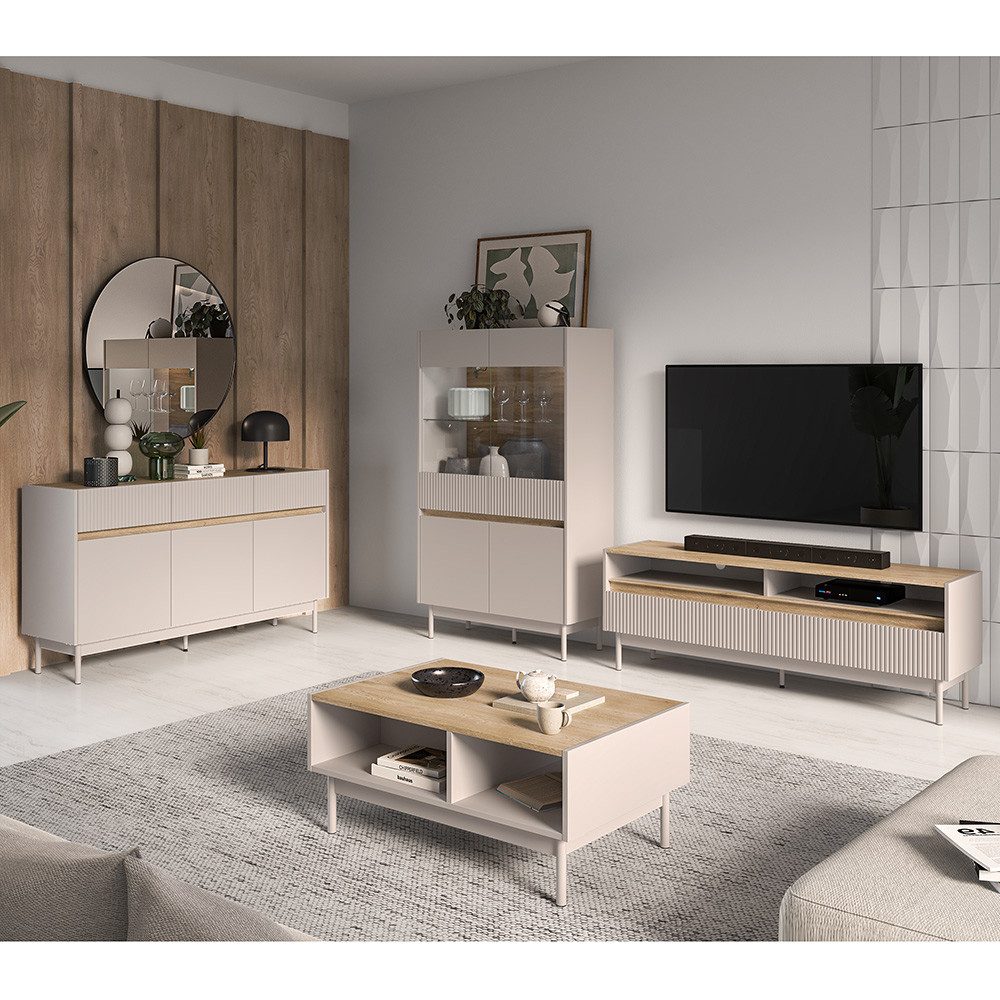 Gestalte dein Wohnzimmer modern und harmonisch mit diesem stilvollen Set in kaschmir matt und edlen Eiche-Dekor-Akzenten. Details in Rillenoptik, das grifflose Design, Softclose-Türen und Schubladen mit Vollauszug sorgen für Komfort und Ästhetik. Das Set besteht aus Lowboard, Couchtisch, Highboard mit stilvoller LED-Beleuchtung und einem großzügigen Sideboard – alles mit unempfindlichen Oberflächen und schlanken Metallfüßen.