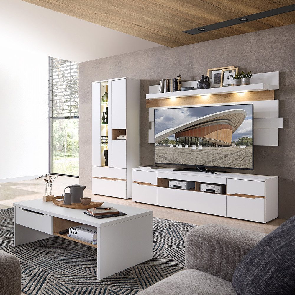 Die matte, weiße Oberfläche mit warmen Artisan Eiche Absetzungen schafft eine harmonische Wohnatmosphäre. Die Vitrine mit LED-Glasbodenbeleuchtung setzt dekorative Highlights, während das Lowboard mit Kabeldurchlässen eine perfekte Lösung für deine Technik bietet. Das Wandboard mit LED-Beleuchtung ergänzt das Set perfekt und der Couchtisch bietet praktischen Stauraum.