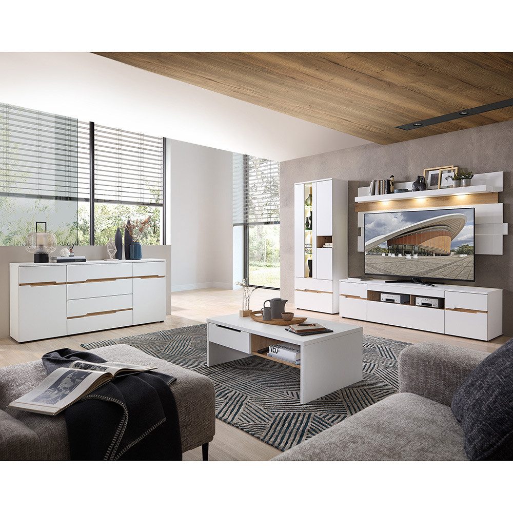 Die matte, weiße Oberfläche mit Artisan Eiche Absetzungen sorgt für eine warme Wohnatmosphäre. Das Set umfasst eine Vitrine mit LED-Glasbodenbeleuchtung, ein großzügiges Sideboard, ein praktisches Lowboard mit Kabeldurchlässen, ein beleuchtetes Wandboard und einen Couchtisch mit Stauraum.