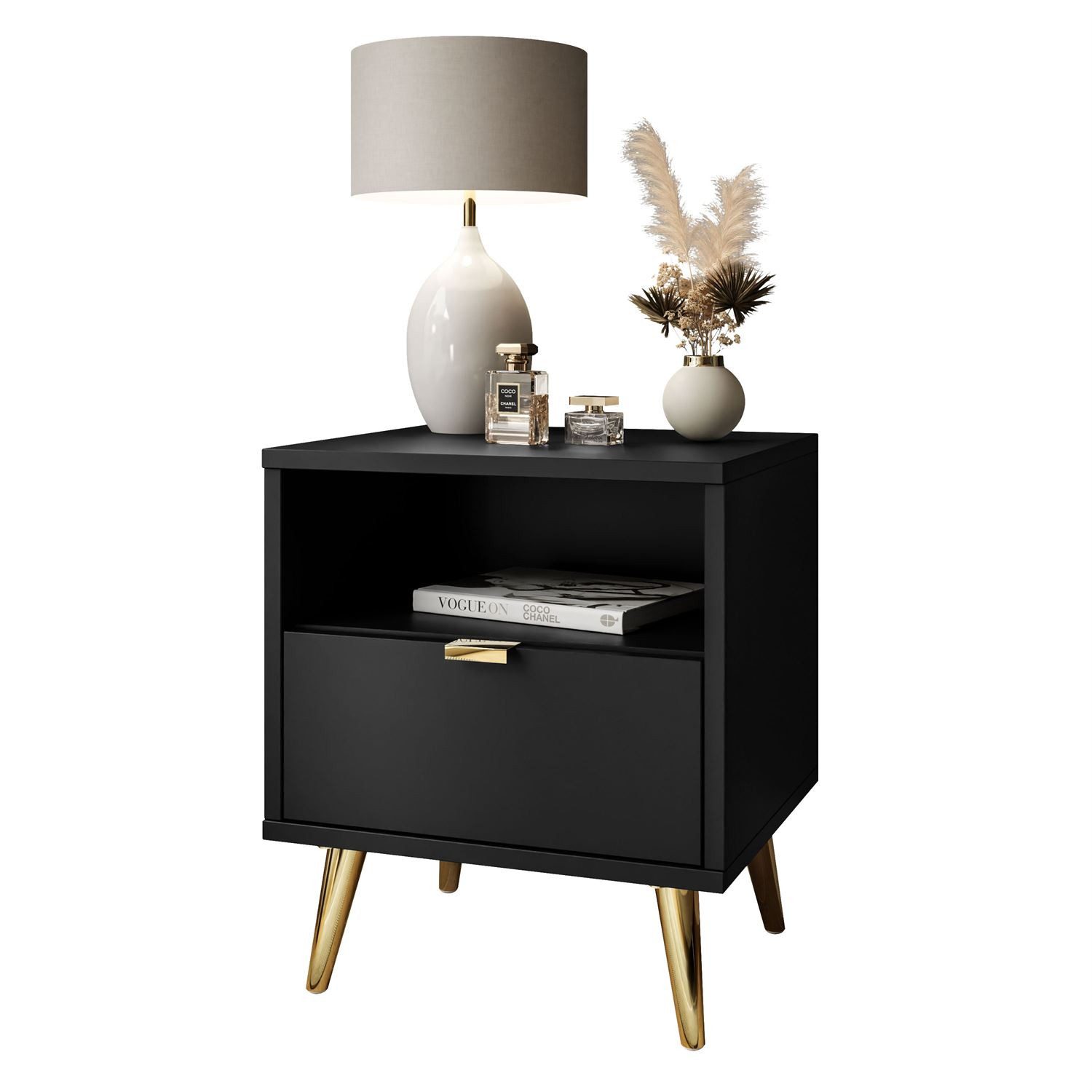 Der Nachttisch ALDO ist eine elegante und funktionale Lösung mit einer geräumigen Schublade mit LED-Beleuchtung und einem offenen Fach. Er ist in drei Farben mit goldenen Details erhältlich und ergänzt jeden Raum perfekt.