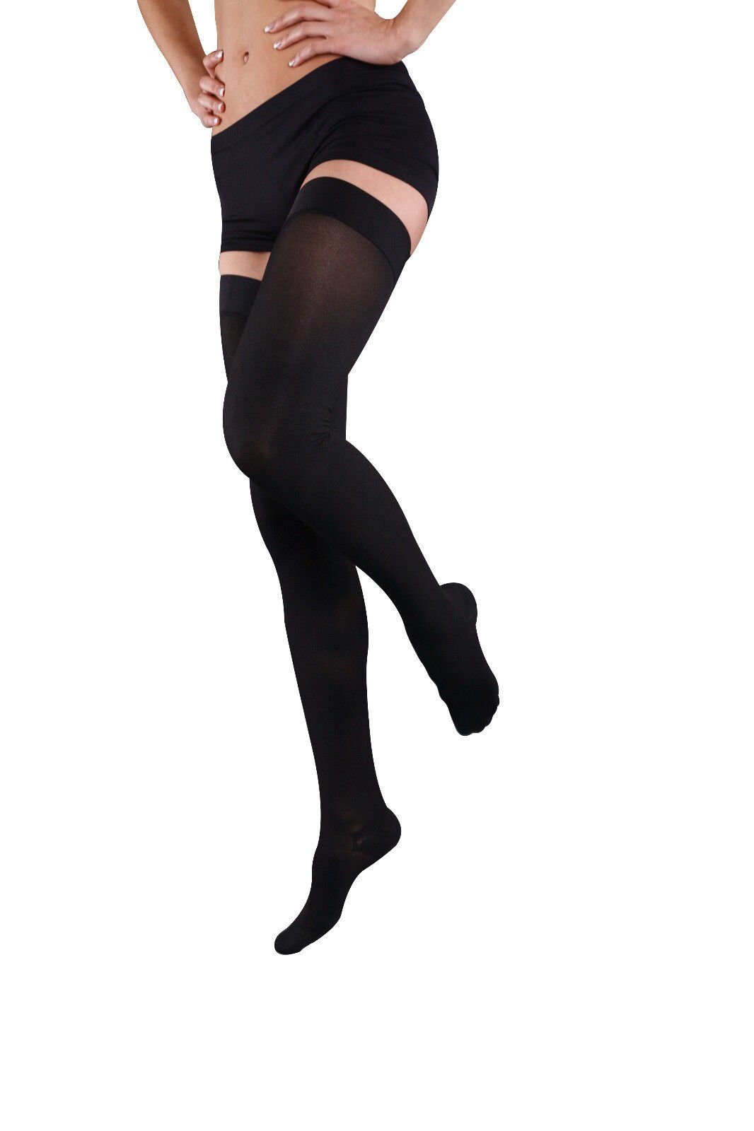 Das Verrutschen der Schenkelstrümpfe wird durch die halterlose Ausführung mit Silikon-Noppen am Rand vermieden.