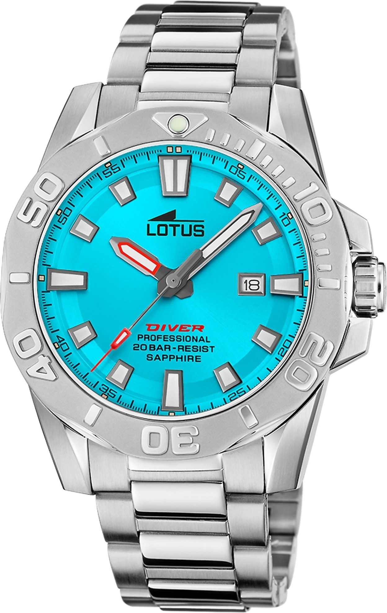Die Elegant Uhr der Marke Lotus hat ein schönes Armband aus Edelstahl in silber mit Faltschließe. Eine Uhr aus der Lotus Classic Kollektion für Herren in der Gehäusefarbe silber mit Armbanduhr. Die Chronographuhr mit Mineralglas hat ein Zifferblatt in der Farbe hellblau. Die Form der Uhr ist rund und das Gehäuse ist groß ca. 44,5mm.