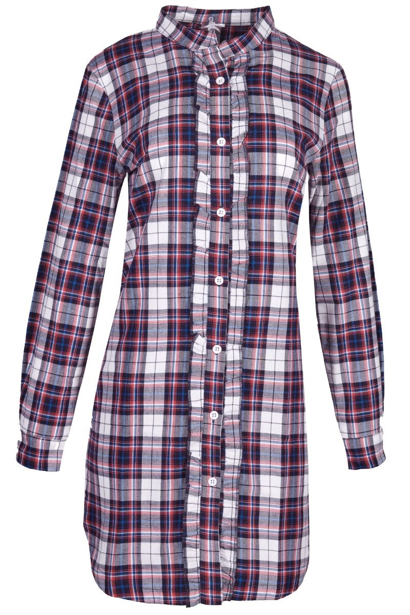 Das gemütliche Damen Nachthemd "Kuschel-Karo" von Louis & Louisa wird aus reiner Baumwolle im kuscheligen Flanell-Stil gefertigt und hat ein stilvolles Karo-Webmuster in Schwarz auf Weiß mit roten und blauen Akzenten. Es ist leicht tailliert geschnitten und vorn mit einer durchgängigen Knopfleiste versehen, die mit schlichten, glänzenden Knöpfen bestückt und beidseitig mit kecken Rüschen mit einer Flatlock-Naht an der Außenkante verziert ist. Der Stehkragen des Sleepshirts sowie die mit je einem Knopf versehenen Manschetten der langen, bequemen Ärmel sind leicht verstärkt und der Saum ist stark abgerundet.