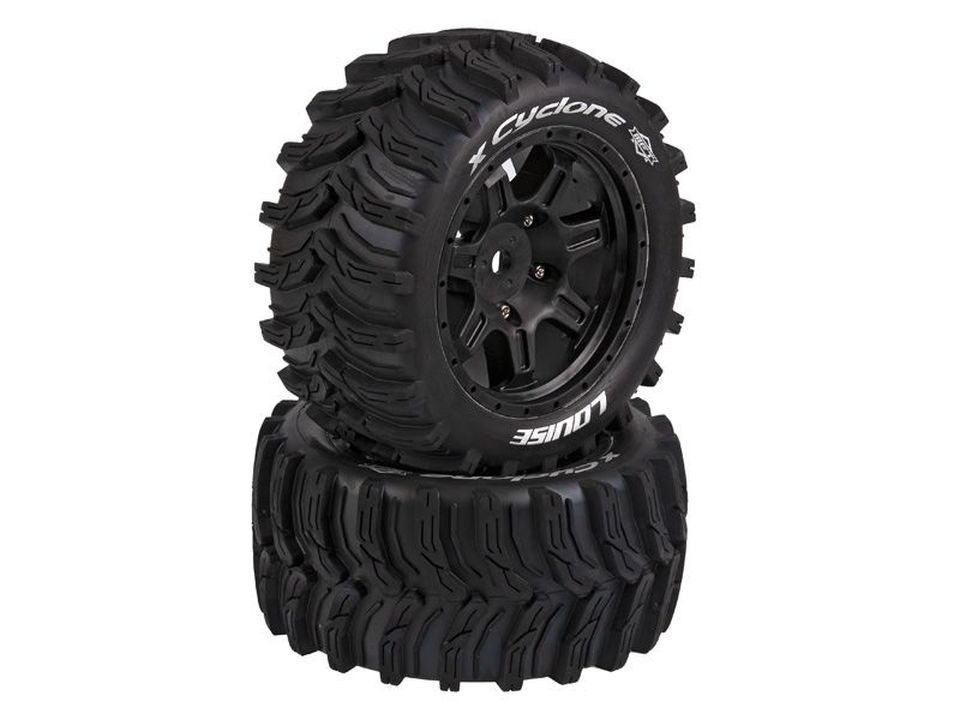 LOUISE RC High-Grip-Reifen mit speziell geformter Reifeneinlage, fertig verklebt auf schwarzen Monster Truck X-Maxx MFT Wettbewerbsfelgen mit 24mm Sechskantaufnahme. Der X-CYCLONE wurde hergestellt mit breiten Längsblöcken. Mit solch einzigartigen Längsblöcken ausgestattet sowie die Karkasse eine standard Bauhöhe aufweist und damit in den Bereich der stabilen Querschnittsreifen fällt, was eine geringe Walktendenz nach sich zieht. Durch das stets einfache und stabile Fahrverhalten der Reifen eignen sich diese daher sehr gut sowohl für sandige, wie auch für leicht löchrige Strecken, ebenso gut auf Kunstrasen oder Teppich. Dieser Reifensatz passt vorne und hinten auf einem Traxxas X-Maxx 1:7 Brushless 4WD Monster Truck.