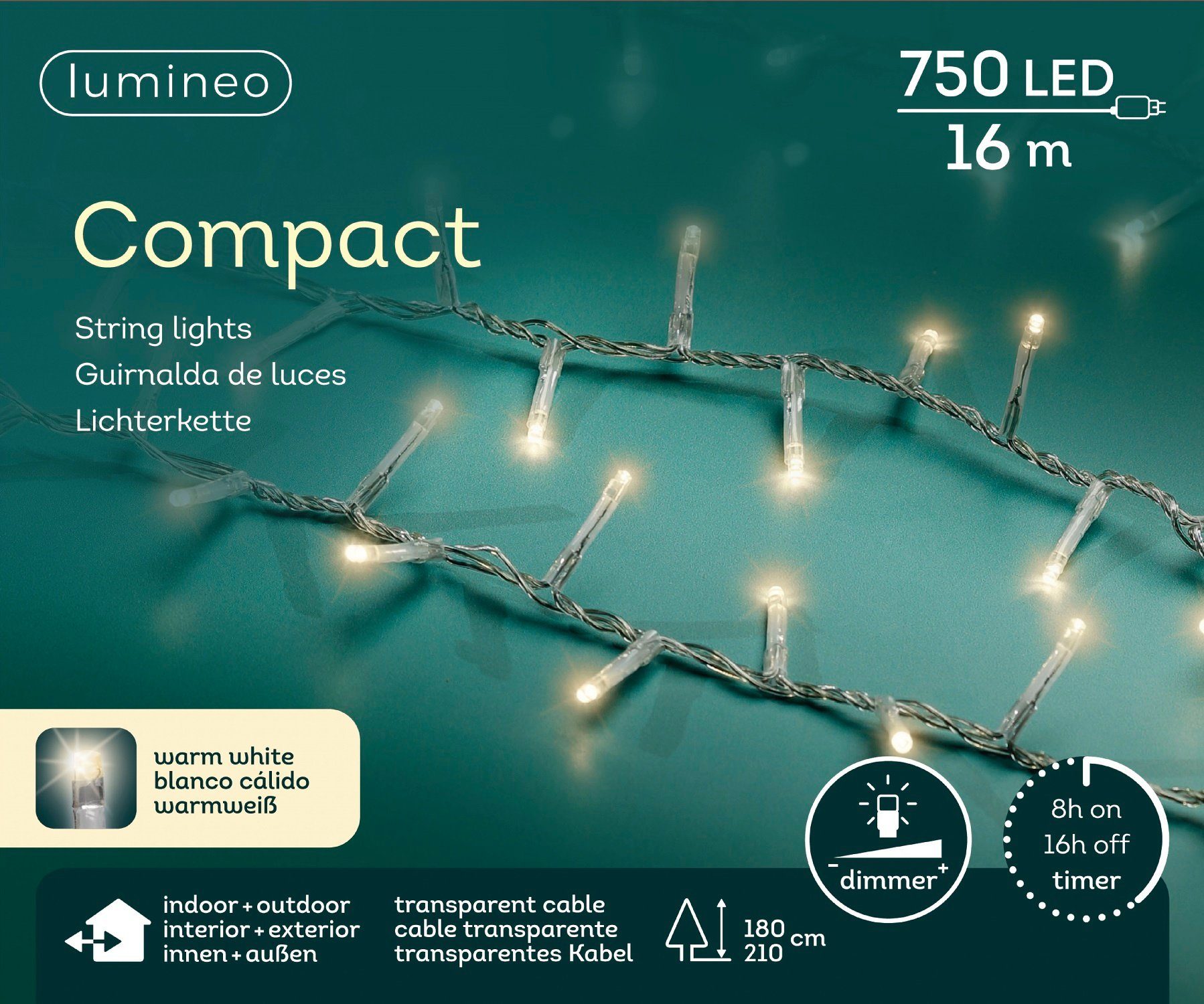 Die Lichterkette verfügt über 750 LEDs, welche in einem warm weißen Ton erstrahlen. Die 5 Stufen-Dimm-Funktion ermöglicht es, die Helligkeit nach Belieben anzupassen und somit die perfekte Atmosphäre zu schaffen. Dank der praktischen Timer-Funktion lässt sich die Lichterkette ganz bequem steuern, sodass sie automatisch 8 Stunden lang eingeschaltet und 16 Stunden ausgeschaltet ist. Diese Funktion spart nicht nur Energie, sondern sorgt auch dafür, dass die Lichterkette jeden Tag zur gleichen Zeit erstrahlt. Die Beleuchtung bietet zudem eine zusätzliche 5 m lange Zuleitung, wodurch die Lichterkette eine Gesamtlänge von 21 m besitzt. Mit dem IP44-Schutz ist sie Wetterbeständig und somit gegen Spritzwasser geschützt. Sie ist für den Innen- und Außenbereich geeignet. Für eine Baumhöhe von 180 - 210 cm geeignet. Mit CE-Gütesiegel ausgezeichnet. Das Kabel ist transparent.