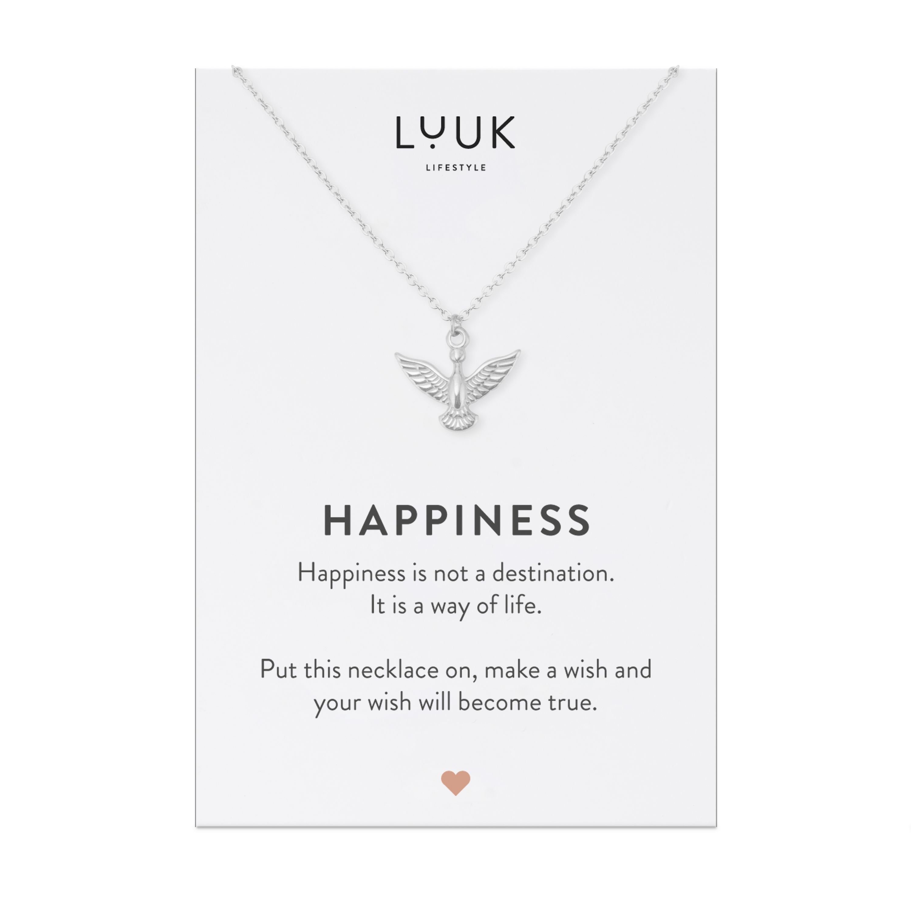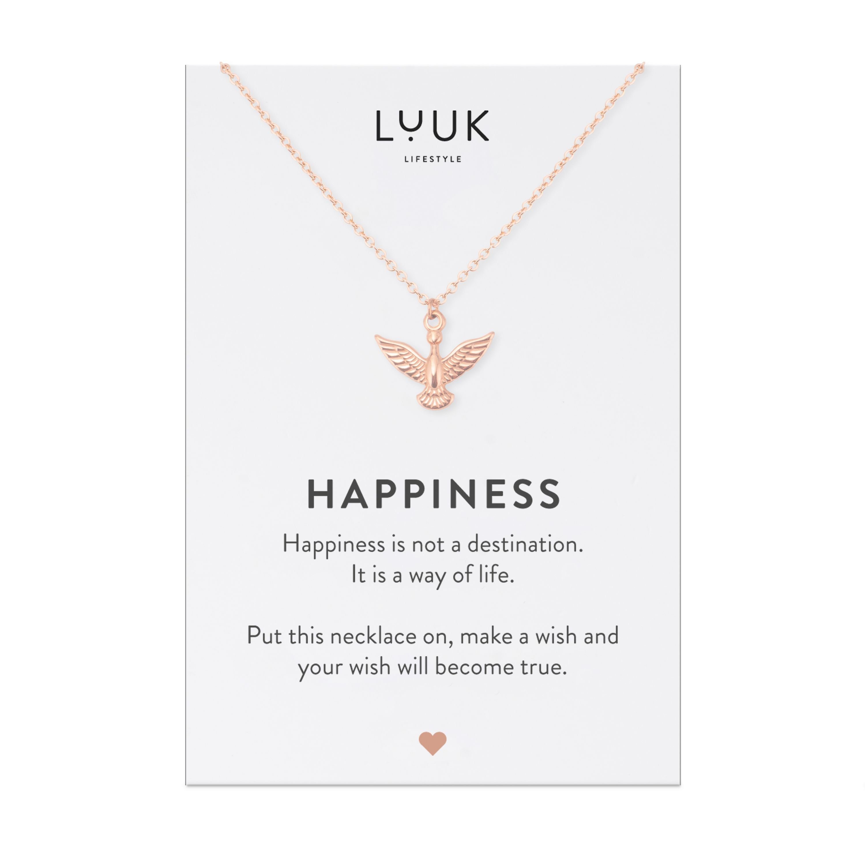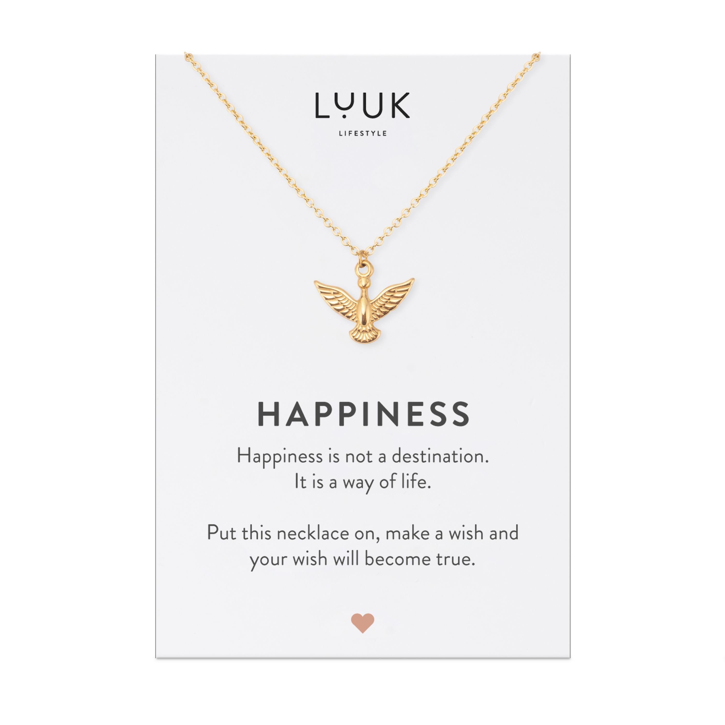 Filigrane Kette in schlichtem Design mit Adler Anhänger. Verfügbar in den Farben Gold, Silber und Roségold inklusive HAPPINESS Spruchkarte. Die Halskette wirkt feminin, stilvoll und ist vielseitig kombinierbar.