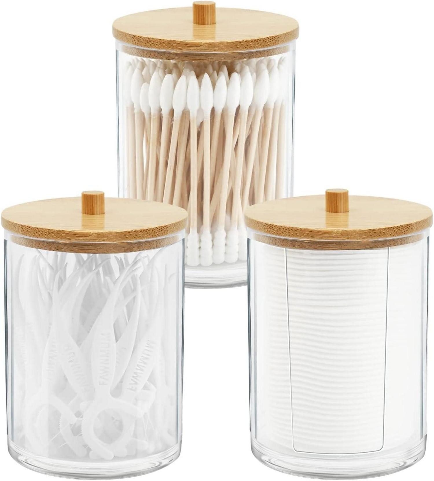 Die Gukasxi 3 Stück Acryl-Qtip-Halter mit Bambus-Deckeln sind nicht nur ein hübsches Accessoire für Ihr Zuhause, sondern auch äußerst praktisch. Diese Gläser eignen sich ideal zur Aufbewahrung von Wattestäbchen, Wattebällchen, Make-up-Pads, Badesalz und vielem mehr.