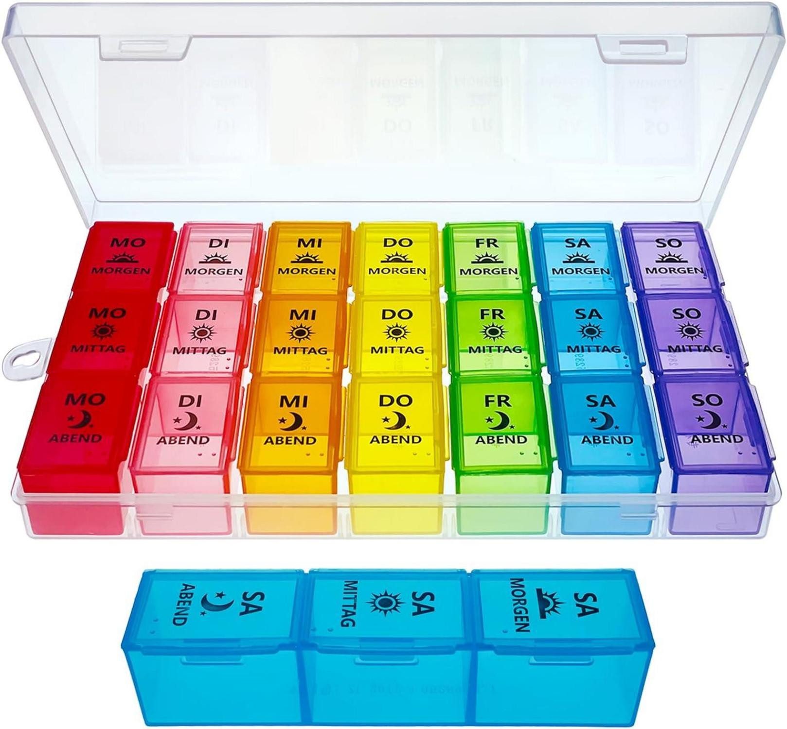Die ZVZM Tablettenbox 7 Tage Morgens Mittags Abends ist eine innovative Lösung, um Ihre Medikamente organisiert und griffbereit zu halten. Jede Tablettenbox wird vor dem Versand gründlich geprüft, um höchste Qualität zu gewährleisten. Hergestellt aus BPA-freiem material, ist diese Pillendose sicher im Gebrauch und geruchlos. Die Deckelschnalle sorgt für einfaches Öffnen, während die Abdichtung fest verschlossen bleibt, um Ihre Pillen sicher aufzubewahren, ohne Verluste zu riskieren.Die Premium Drucketiketten auf den Deckeln sind deutlich lesbar und widerstandsfähig gegen Verblassen. Somit ist es einfach, den Überblick über Ihre Medikamente zu behalten. Diese Funktion ist besonders nützlich für Kinder oder ältere Menschen.Mit seiner handlichen Розмір und der Tragbarkeit ist der Tabletten Organizer ideal für den täglichen Gebrauch und perfekt für unterwegs. Die einzelnen Pillenkästen passen bequem in jede Tasche oder Geldbörse.Die ZVZM Tablettenbox bietet eine wirklich große Kapazität. Jedes Gitter kann problemlos bis zu 12 große Vitamintabletten oder Fischölpillen aufnehmen. Mit 7 verschiedenen Farben für jeden Wochentag und jeweils 3 Fächern pro Tag haben Sie genug Platz für Ihre gesamte Wochendosis.Halten Sie Ihre Medikamente immer griffbereit und gut organisiert mit der ZVZM Tablettenbox 7 Tage Morgens Mittags Abends. Ideal für Kinder, ältere Menschen und Personen mit arthritischen Händen.
