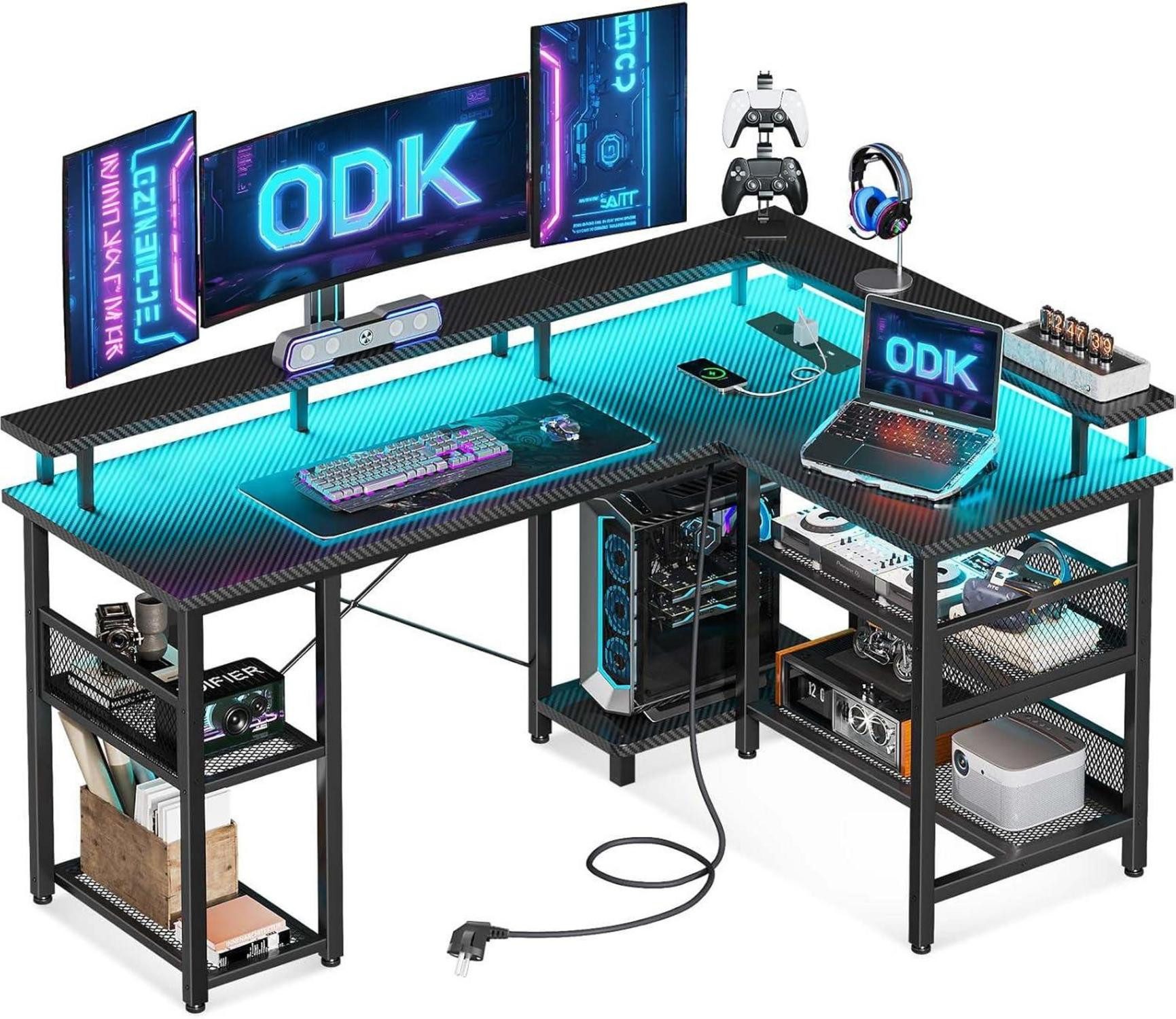 ODK Gaming Tisch mit LED, Reversibel Gaming Schreibtisch mit 2 Steckdosen & 2 USB-Ladeanschlüssen, Eckschreibtisch Groß mit Netzablage, Kohlefaser Schwarz 150×102cm bietet Komfort, Funktionalität und Stil in einem. Mit einer großzügigen Tischoberfläche und einer extra langen Monitorhalterung verbessert dieser L-förmige Schreibtisch nicht nur Ihre Gaming- oder Arbeitsumgebung, sondern auch Ihre Körperhaltung. Die verstellbare Regalhöhe des Aufbewahrungsregals ermöglicht es Ihnen, Ihre persönlichen Anforderungen anzupassen und alles griffbereit zu halten.