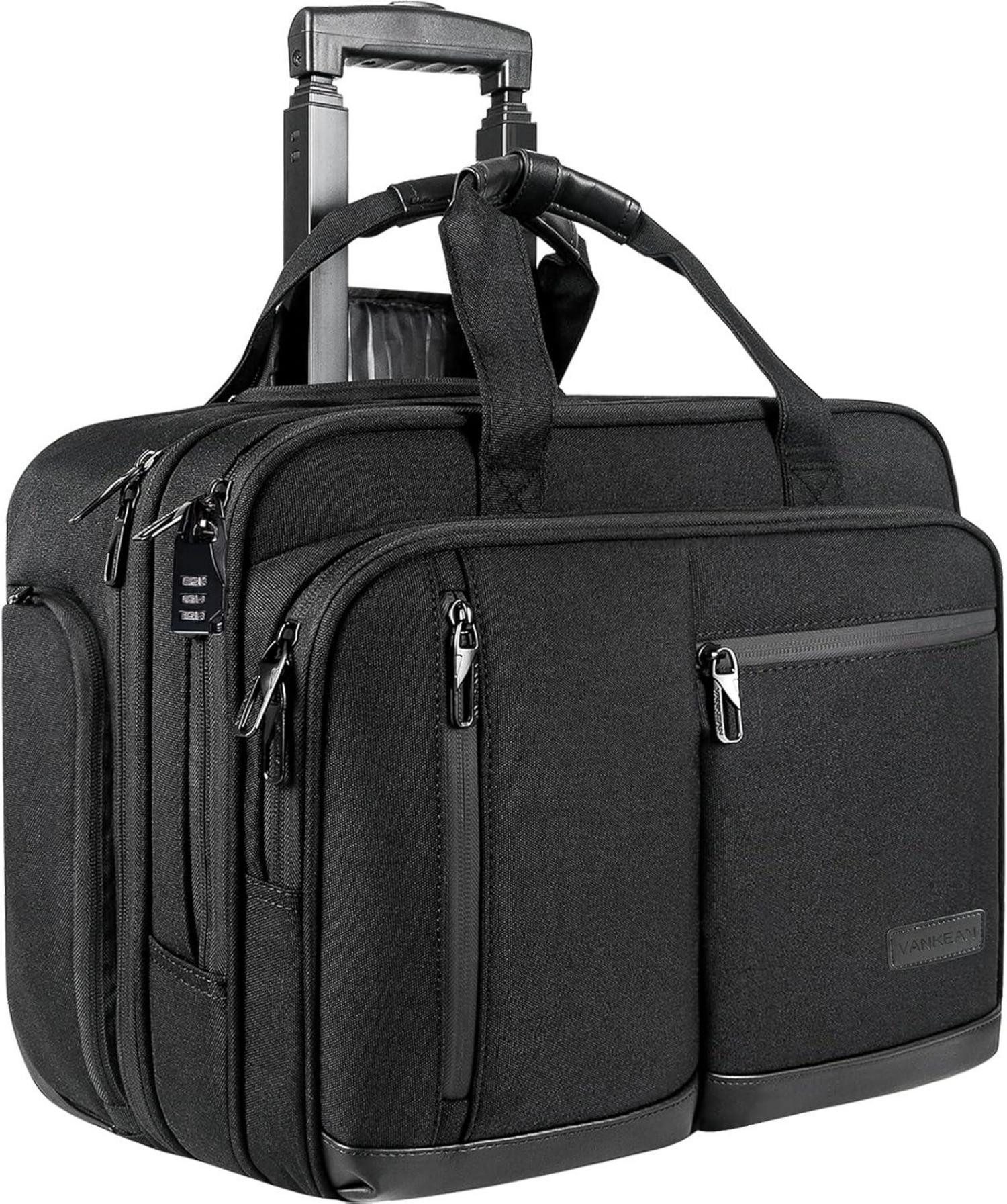 EINFACH ZU TRAGEN UND ZU REINIGEN: Teleskopgriff per Druckknopf und 2 hochwertige leise Räder ermöglichen komfortableres Reisen. Der Teleskopgriff lässt sich bei Nichtgebrauch in ein Reißverschlussfach einziehen. Verfügt über zwei Inline-Skate-Räder für schnelle Mobilität während der Fahrt. Darüber hinaus lässt sich die Tasche mit einem gut gestrickten „Gepäckgurt“ ganz einfach am Trolley Ihres Gepäcks befestigen, was Ihre Reise und Geschäftsreisen bequemer macht. LANGLEBIGES UND BENUTZERFREUNDLICHES DESIGN: Die VANKEAN Laptop-Rolltasche hat Metallreißverschlüsse und einen wasserdichten Bodenschutz an den Ecken und eine Trittplatte; Langlebiger Aluminium-Teleskopgriff für Benutzer unterschiedlicher Körpergröße.RFID-DESIGN-COMPUTERTASCHE: Anti-Diebstahl-Design Frequenzidentifikationsblockierungstechnologie in Organizer-Taschen, die mit dünnem, abschirmendem Stoff ausgekleidet sind, um zu verhindern, dass Funkwellen von US-Pässen und bestimmten Kredit-/Debitkarten übertragen werden.MULTIFUNKTIONALES FACH: Die rollende Laptop-Aktentasche von VANKEAN verfügt über 1 Hauptfach, das separaten Platz für Ihren 17,3-Zoll-Laptop und alle Ihre Gegenstände bietet. Das gepolsterte Laptopfach bietet perfekten Schutz für Ihren Laptop. 1 hinteres Ablagefach kann Ihre wichtigen Dinge ordnen. 2 Fronttaschen organisieren Ihre Stifte, iPad oder Tablet. 2 große Taschen mit Reißverschluss an jeder Seite können Ihren Regenschirm, Ihre Wasserflasche usw. aufnehmen. Ideal, um diese Tasche als Handgepäck für eine Geschäftsreise über Nacht zu verwenden.ROLLTASCHE AUS WASSERABWEISENDEM STOFF: Die Rolltasche von VANKEAN besteht aus wasserabweisendem Canvas-Stoff. Abmessungen: 18,1 "x14,2" x 9 "; Gewicht: 6,33 LBS. Die maximale Довжина des Teleskopgriffs: 21,7 Zoll. ( Passt in die meisten Gepäckfächer der Fluggesellschaften und erfüllt die Anforderungen der meisten Fluggesellschaften an Handgepäckgrößen. In Bezug darauf, ob es ob es ist unter den Sitz passt, müssen Sie vor dem Kauf die Gepäckgrößenanforderungen der Fluggesellschaft bestätigen.