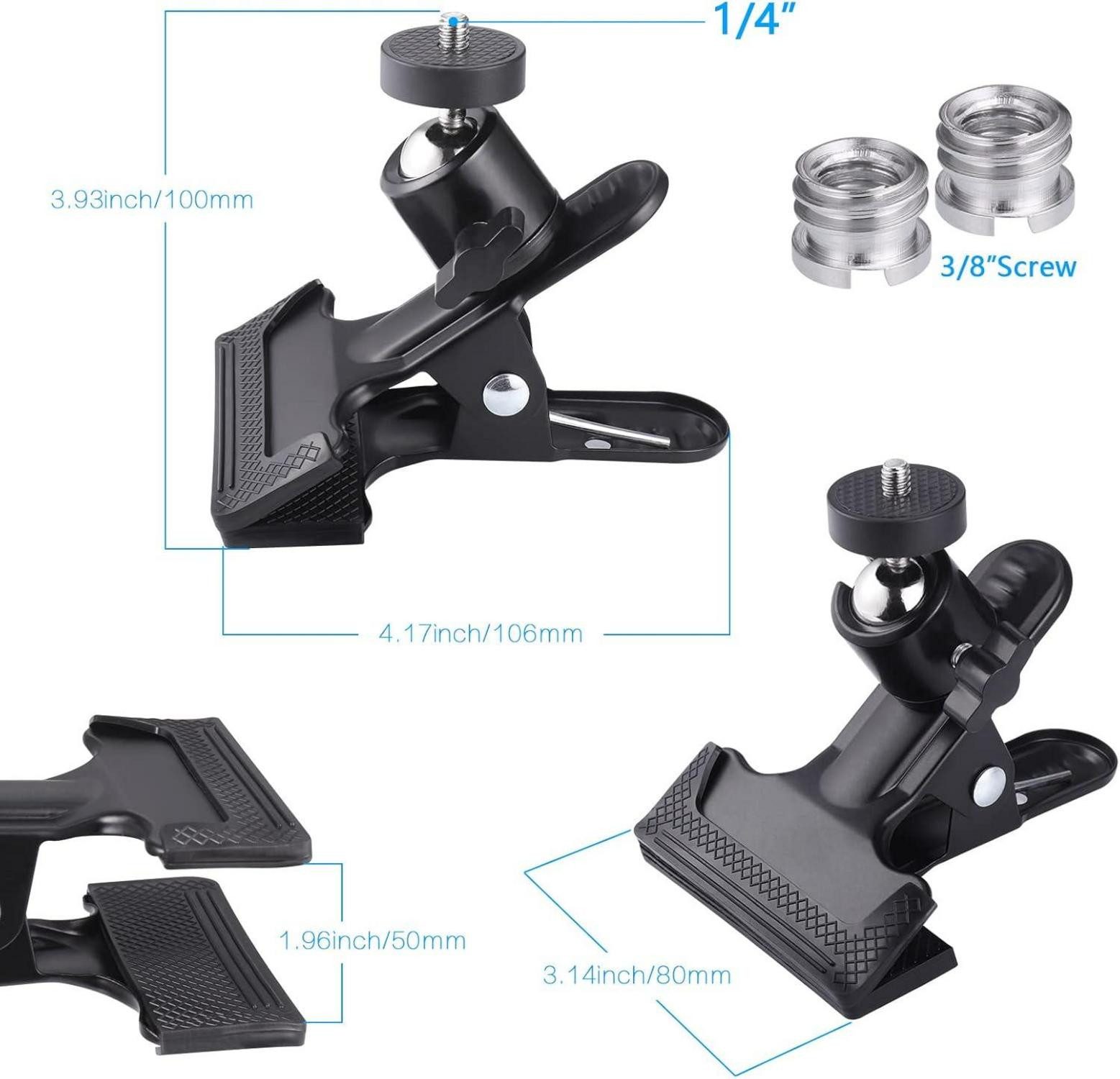 Die 360-Grad-drehbare Kugel ermöglicht es Ihnen, den Aufnahmewinkel frei anzupassen, um die bestmöglichen Bilder zu erhalten. Darüber hinaus sind im Set 2 Stück 1/4" zu 3/8" Stecker Gewindeschraube Adapter enthalten, die die Kompatibilität mit verschiedenen Kameraausrüstungen gewährleisten. Verbessern Sie Ihre Arbeitseffizienz und erleben Sie eine neue Flexibilität in Ihren Fotoaufnahmen mit dem Hejo Klemmhalter Set.