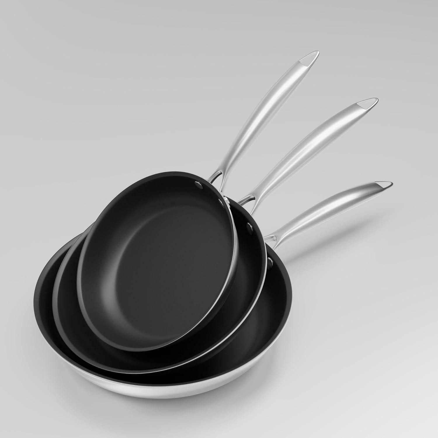 Mit dem dreiteiligen Set können Sie unterschiedliche Speisen zubereiten und die Pfannen auf verschiedenen Herdarten verwenden. Die Tri-Ply Construction sorgt für eine effiziente Wärmeverteilung und eine gleichmäßige Erwärmung der Pfannen.