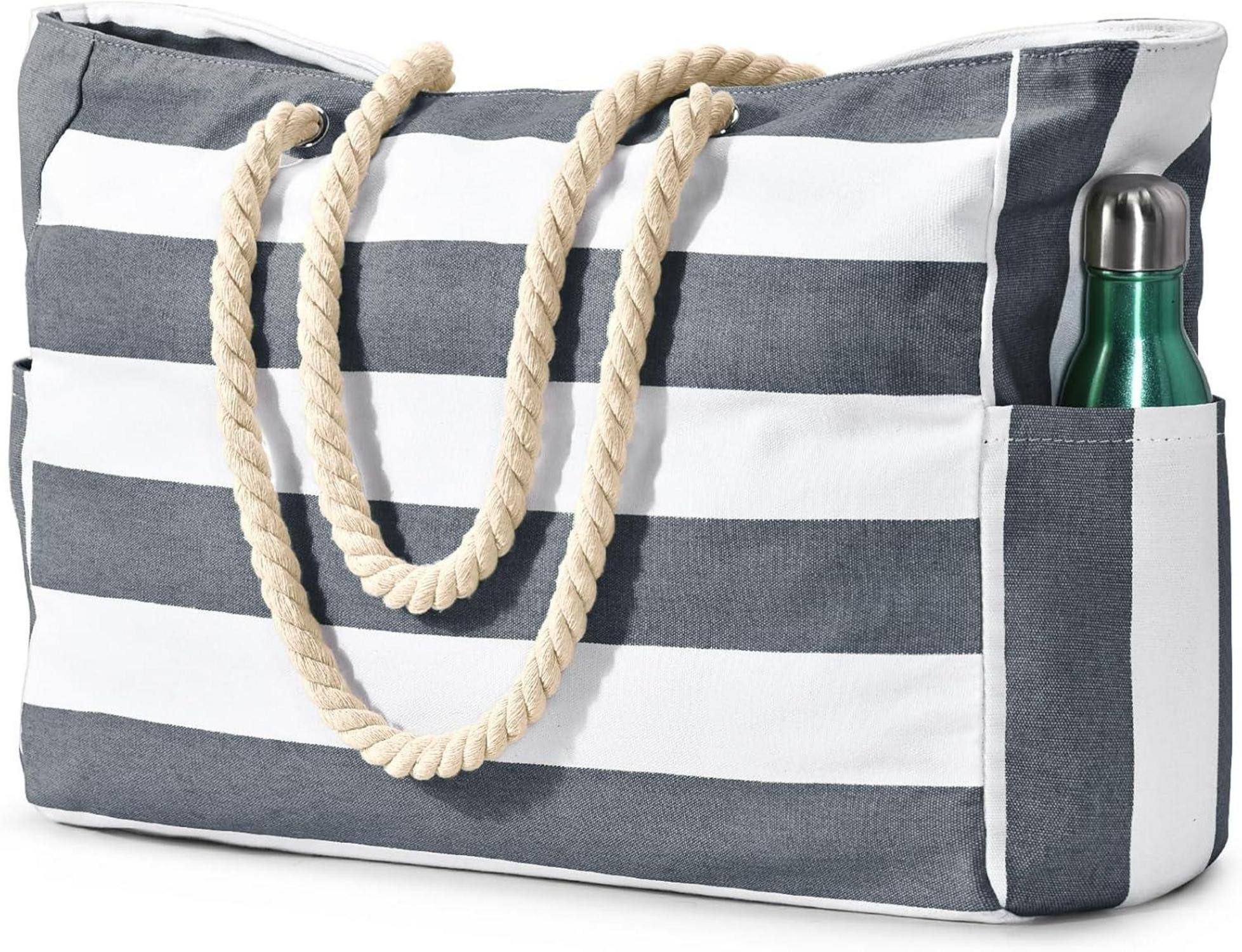 Die Strandtasche besticht durch ihr modisches Streifenmuster, das in vielen schönen Farben erhältlich ist. Sie verfügt über einen sicheren Reißverschluss, um Ihre Wertsachen zu schützen, sowie 2 seitliche Flaschentaschen und 1 Innentasche mit Reißverschluss, in der Sie Ihre kleinen persönlichen Gegenstände sicher aufbewahren können.