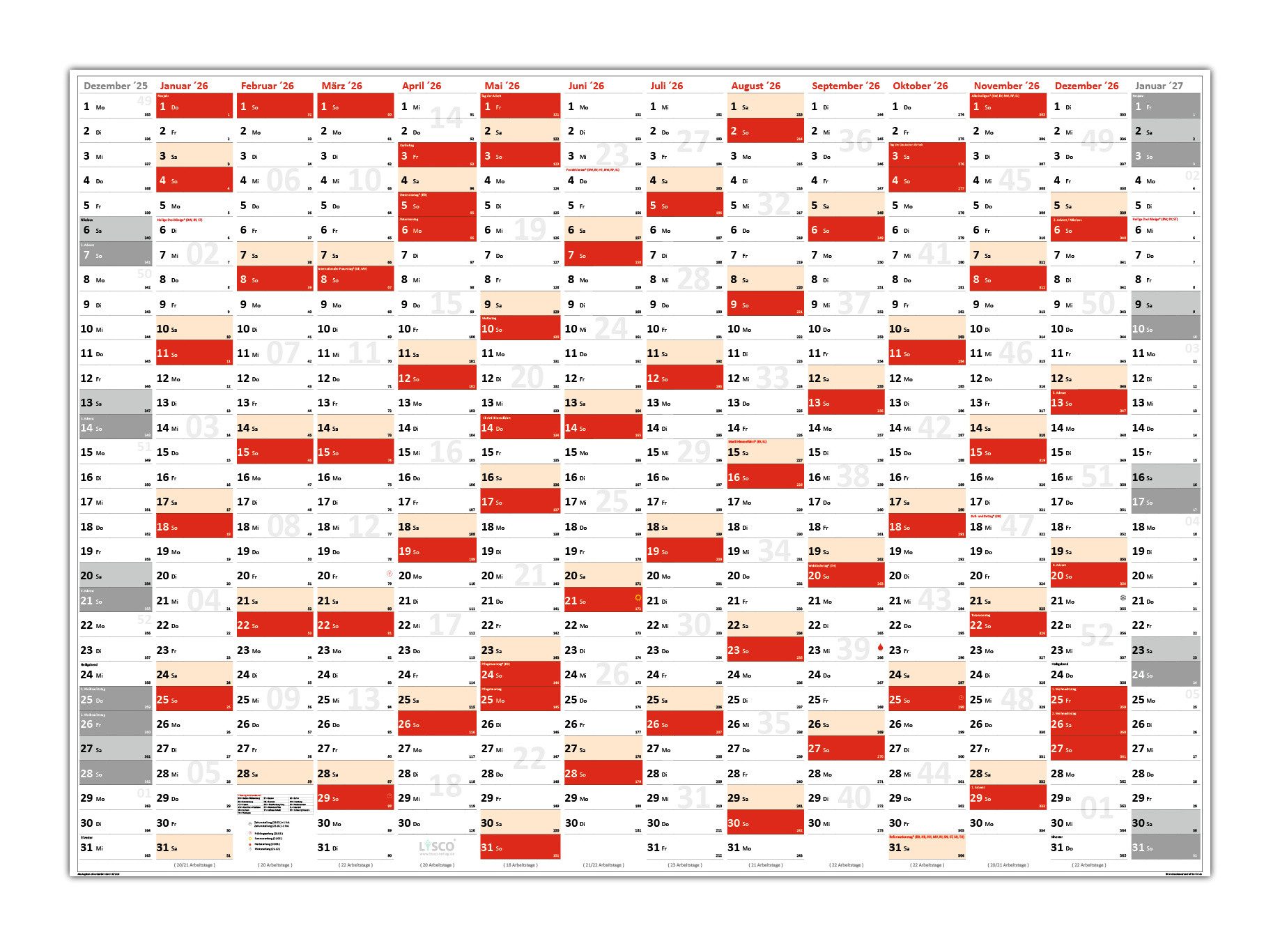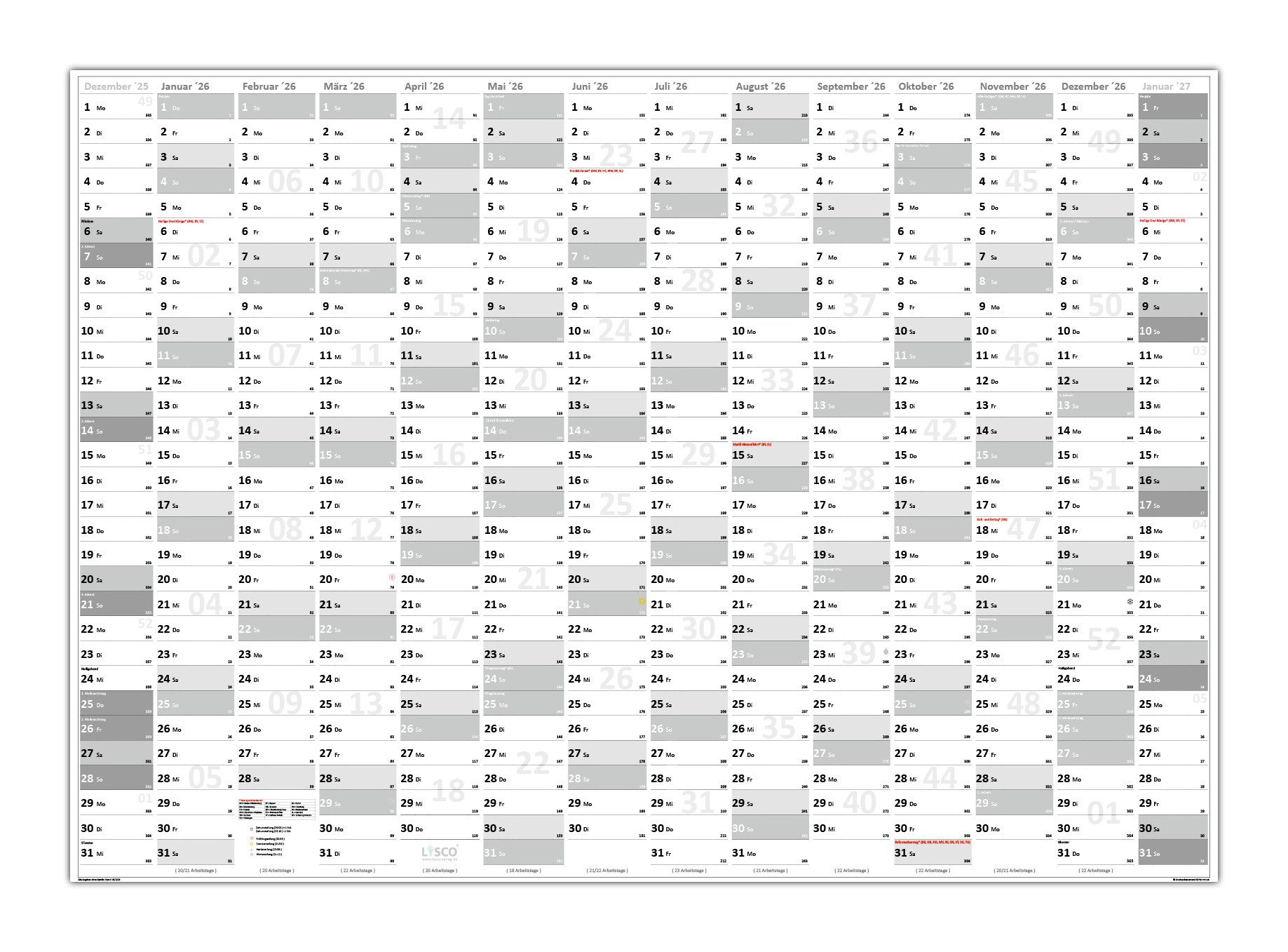 Wandkalender Wandplaner für 2025 + 2026 oder nur 2026 mit folgenden Eigenschaften: