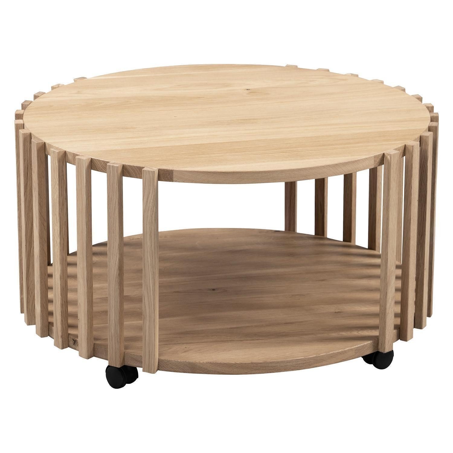 Der Couchtisch MATS der Marke M2 ist aus massivem Wildeichenholz gefertigt und mit einer geölten Oberflächenbehandlung versehen. Eine integrierte Bodenfläche bietet zusätzlichen Stauraum. Ausgestattet mit Rollen lässt sich der Tisch flexibel positionieren. Der Durchmesser beträgt 73 cm, die Höhe liegt bei 40 cm.