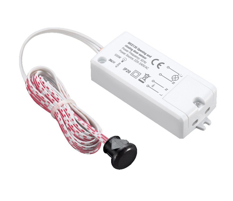 MCE135 ist ein Infrarot-Nahbereichssensor. Der Schalter wird durch Сховати und Öffnen der Tür gesteuert. Wenn Sie die Tür öffnen, erkennt der Sensor Bewegungen und schaltet das Licht ein. Solange die Tür offen ist, leuchtet das Licht. Ideal für Orte, an denen zeitweiliges Licht benötigt wird.