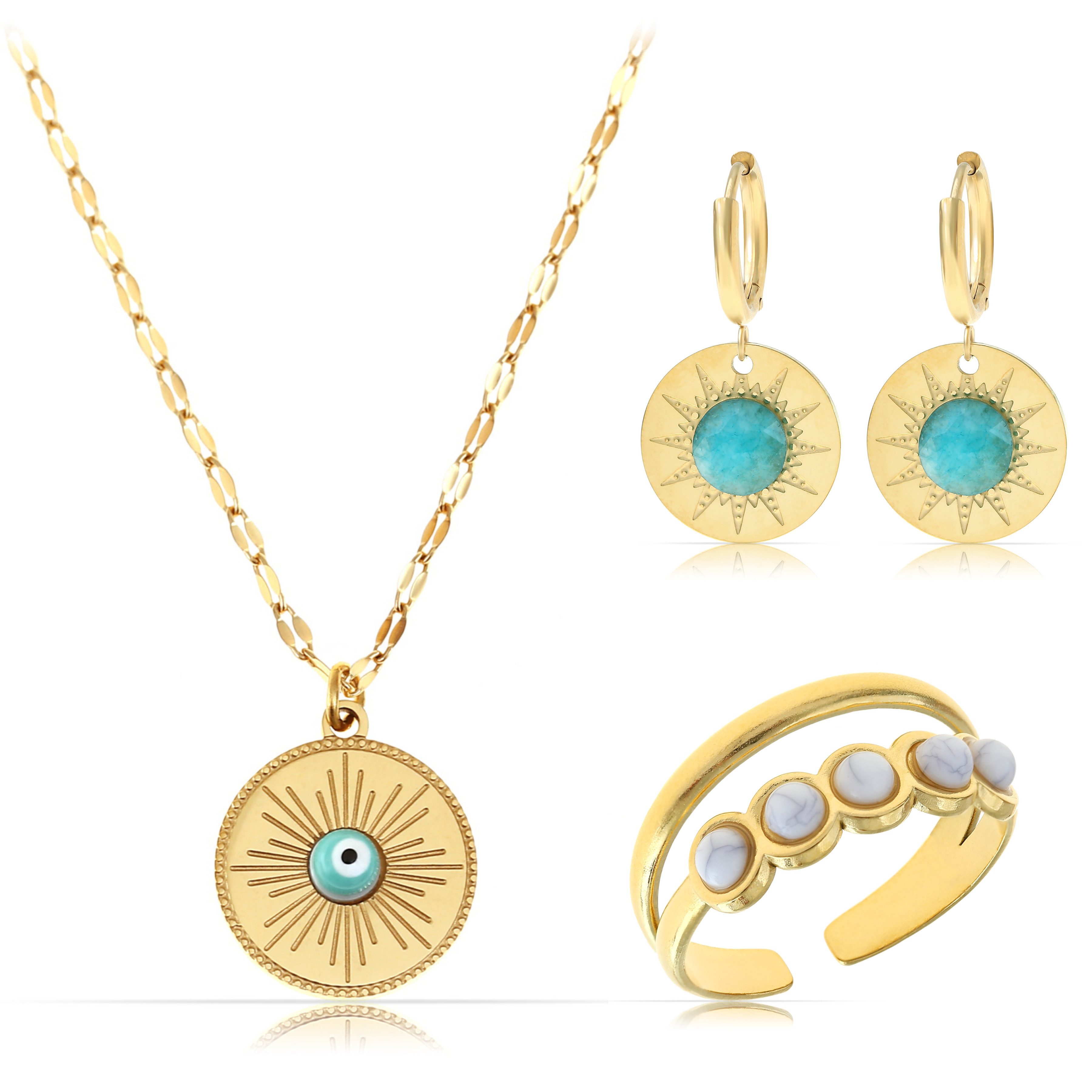 Dieses dreiteilige Schmuckset kombiniert eine filigrane Halskette, einen verstellbaren Ring und elegante Hängeohrringe im goldfarbenen Boho-Stil. Türkisfarbene Akzente verleihen dem Set eine sommerliche Note und machen es zu einem besonderen Blickfang für verschiedene Anlässe.