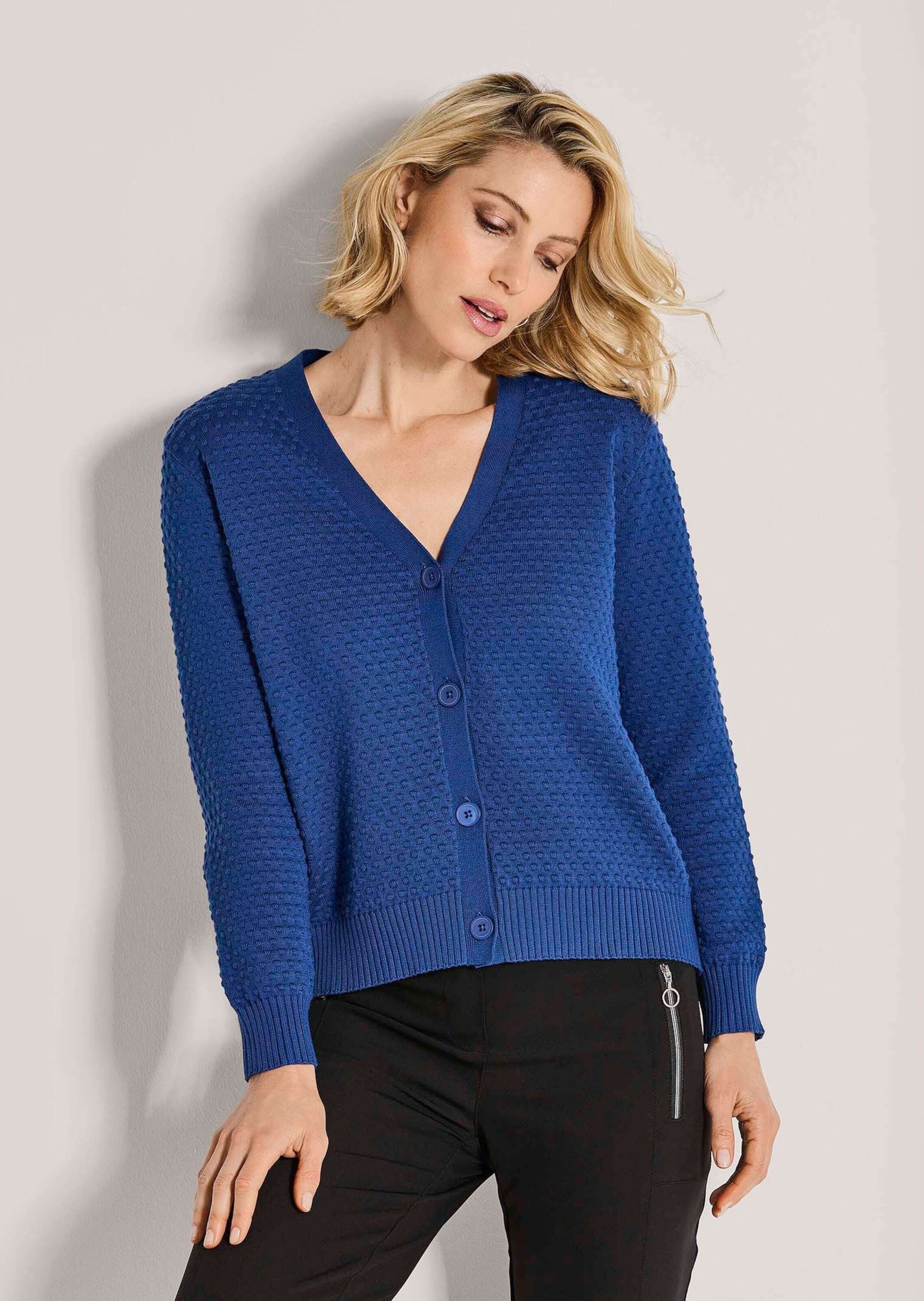 Ihr modischer Schnitt und die wertvolle Natürlichkeit machen diese Strickjacke zu einem echten Must-have. Hautsympathische Baumwolle ist angenehm im Tragegefühl und begeistert hier mit trendstarker Noppen-Struktur. Die entspannte Form bringt Abwechslung in den Look und ist beliebig kombinierbar. Ein klassischer V-Ausschnitt mit Knopfleiste und farblich abgestimmten Knöpfen bringt Ausgewogenheit ins Design und unterstreicht die klare Linie. Die Abschlüsse der langen Ärmel sind wie die Saumkante mit formstabilen Rippenblenden gearbeitet. Eine vielseitig tragbare Strickjacke, die Tradition und Moderne perfekt kombiniert.