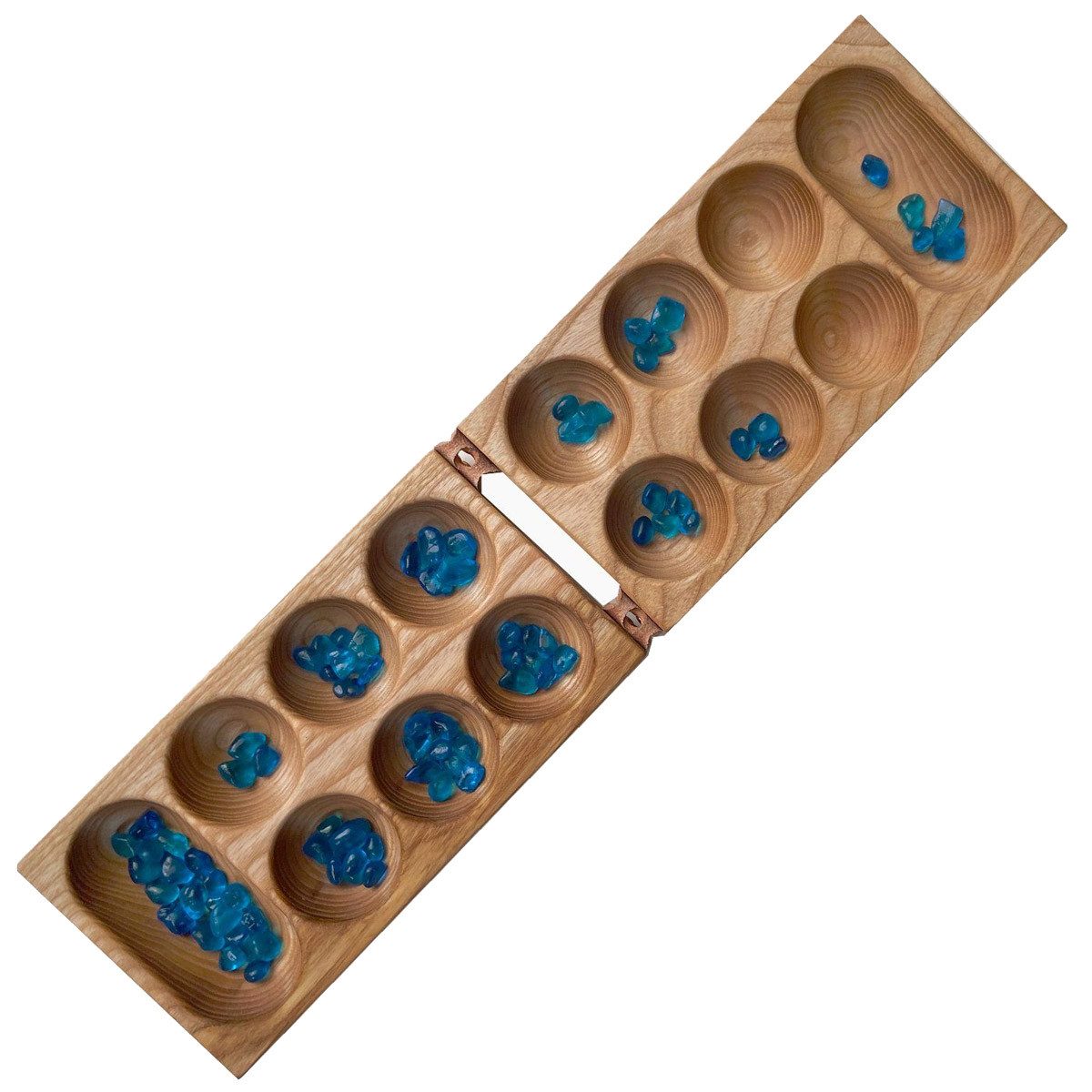 Das Kalaha-Spiel aus Eschenholz ist nicht nur ein optisches Highlight, sondern auch äußerst praktisch. Ob bei Familienabenden, im Kinderzimmer oder auf Reisen – durch das klappbare Brett lässt es sich platzsparend transportieren. Die bunten Glassteinchen in Karibik-Blau machen das Taktikspiel zu einem besonderen Erlebnis mit hohem Wiederspielwert.