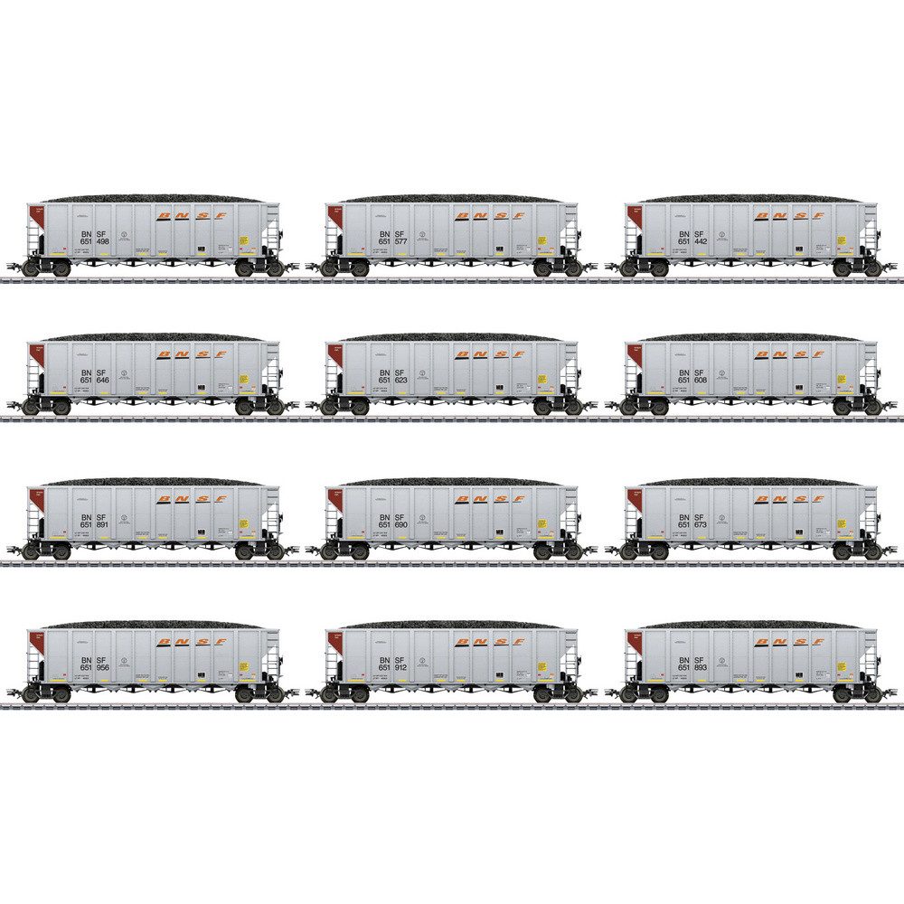 Vorbild: Zwölf Kohletransportwagen, sogenannte Hopper Cars, der Burlington Northern Santa Fe, LLC (BNSF). Ausführung mit fünf Entladeeinrichtungen am Wagenboden. Aktueller Betriebszustand.