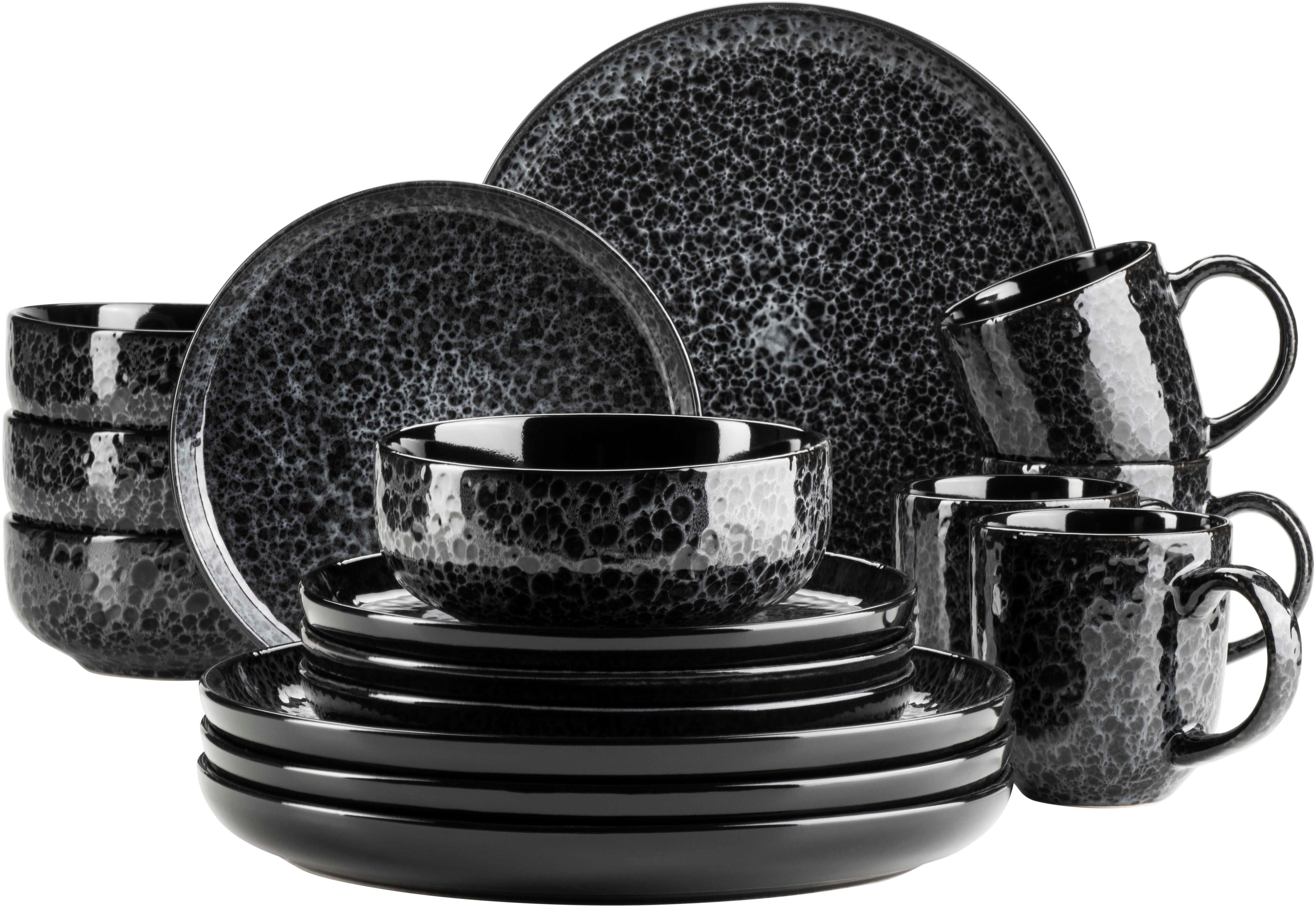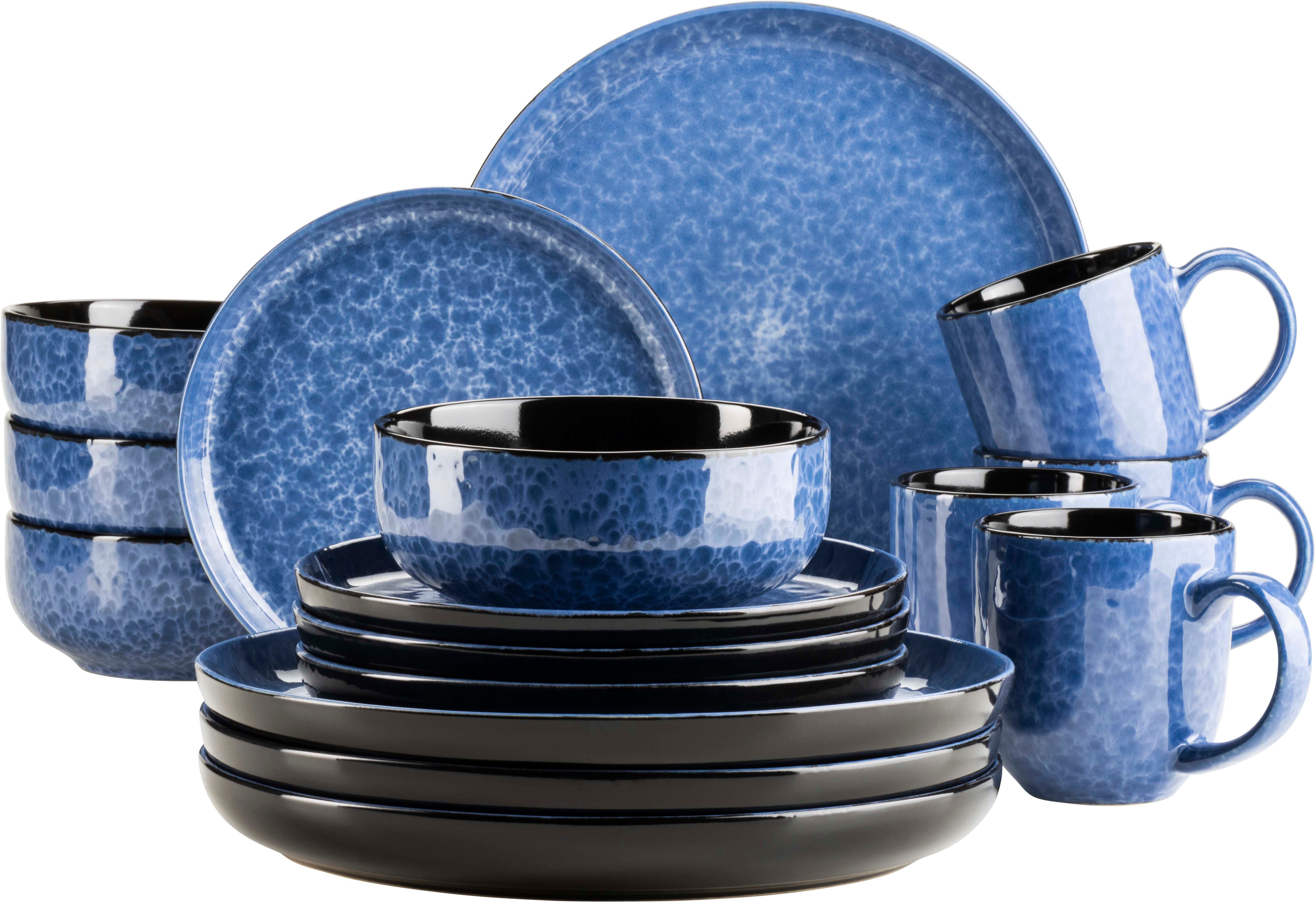 Das Speiservice ist aus hochwertiger Keramik gefertigt und kombiniert kompakte, runde Formen mit einer besonderen, zweifarbigen Reaktiv Glasur