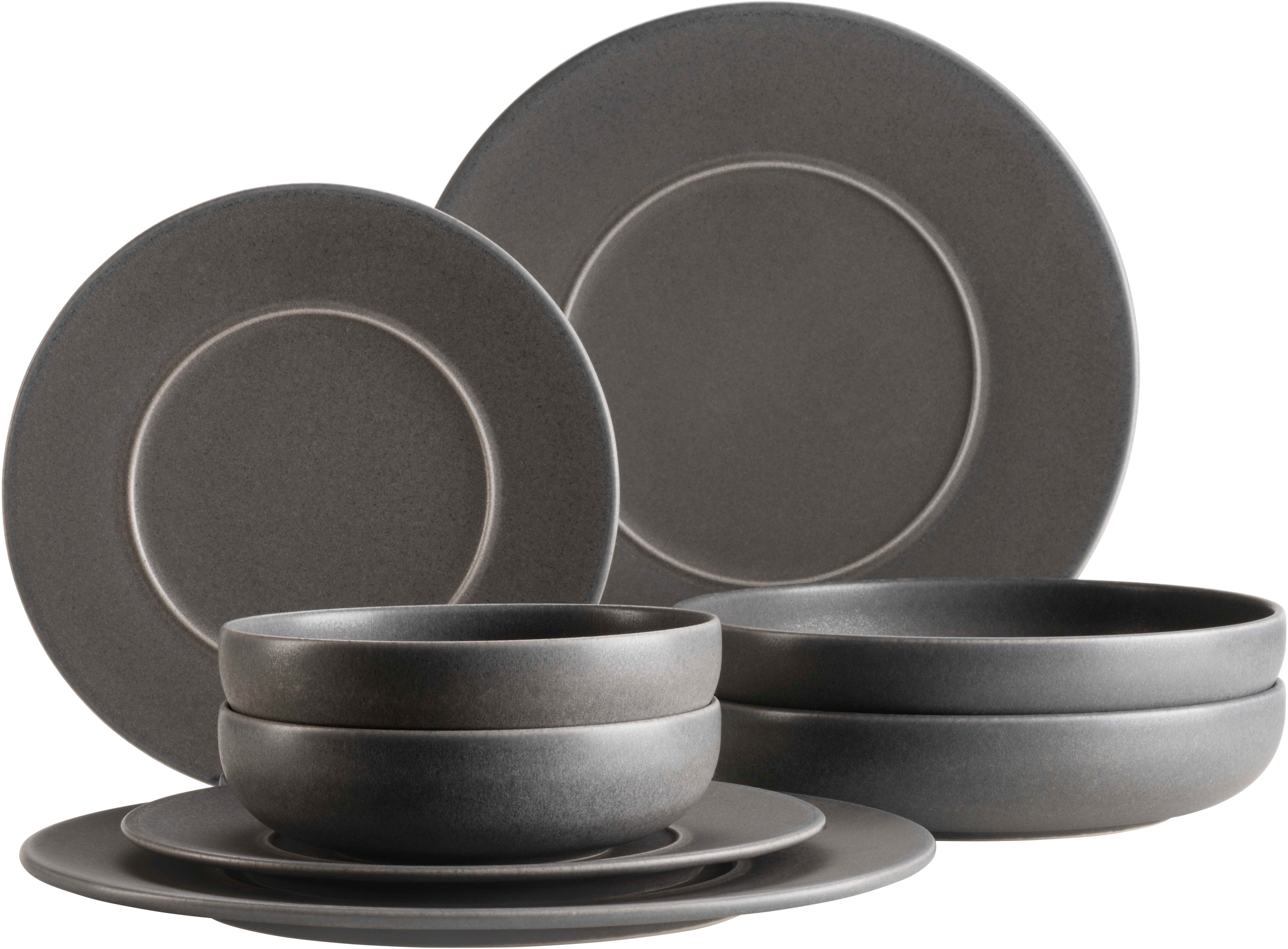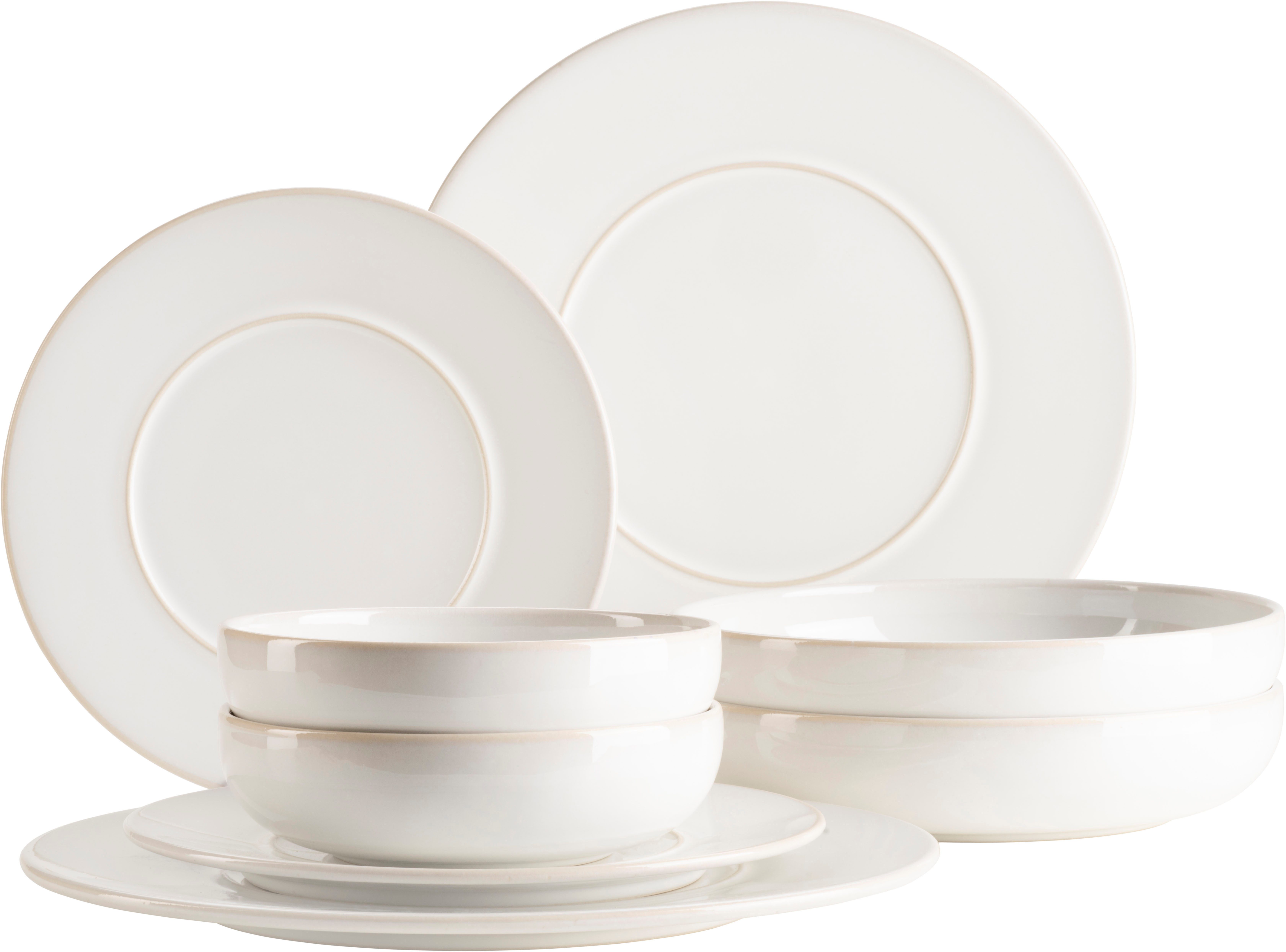 Dieses 8-teilige Kombiservice für 2 Personen besteht aus robustem Steinzeug und umfasst 2 Teller flach, 2 Dessertteller und 2 Schüsseln