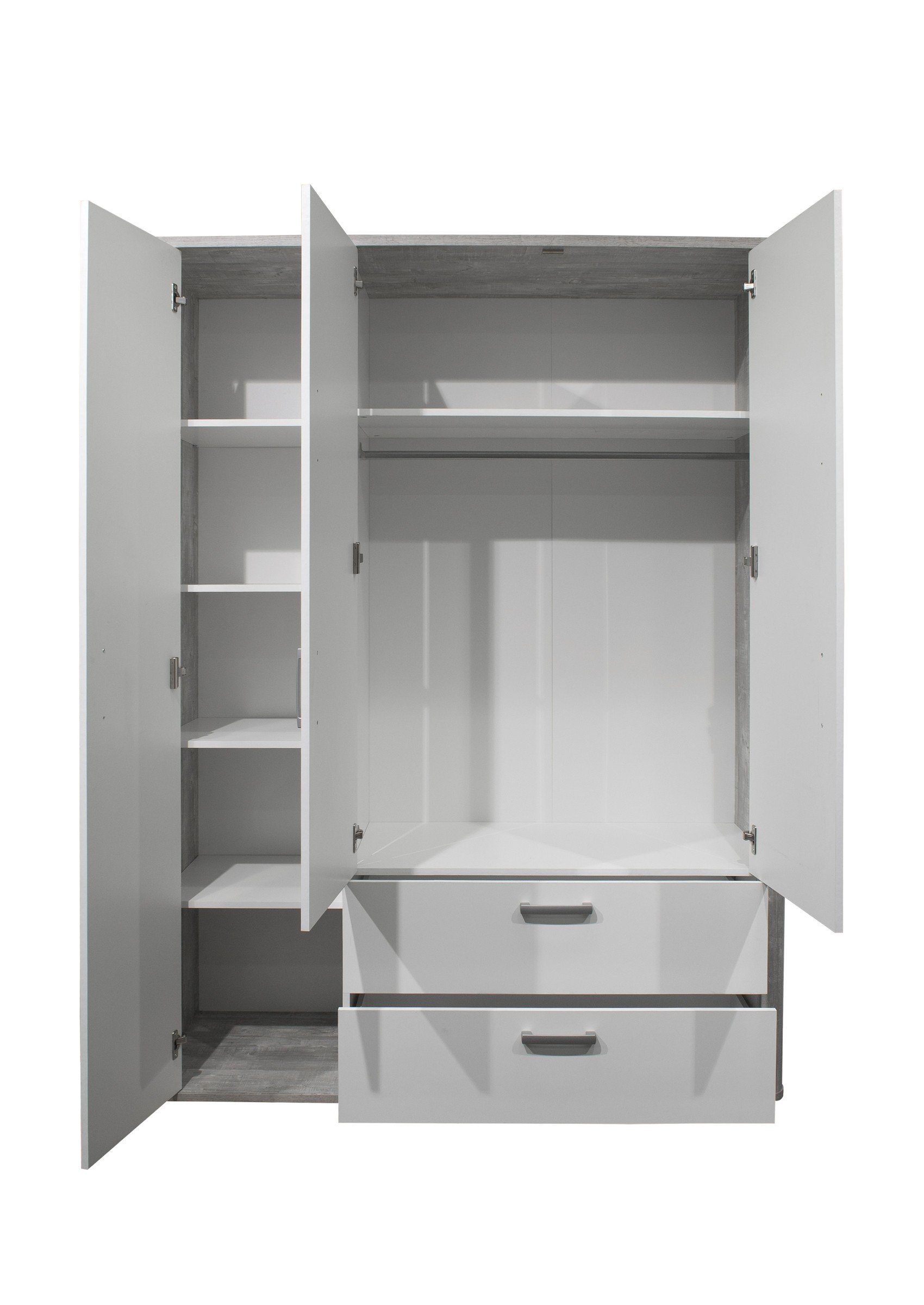 Ausstattung | links: 1 Tür mit Dämpfung, 1 fester Mittelboden, 3 verstellbare Einlegeböden; rechts: 2 Türen mit Dämpfung, 1 fester Mittelboden, 1 Kleiderstange, 2 Schubkästen mit Selbsteinzug |