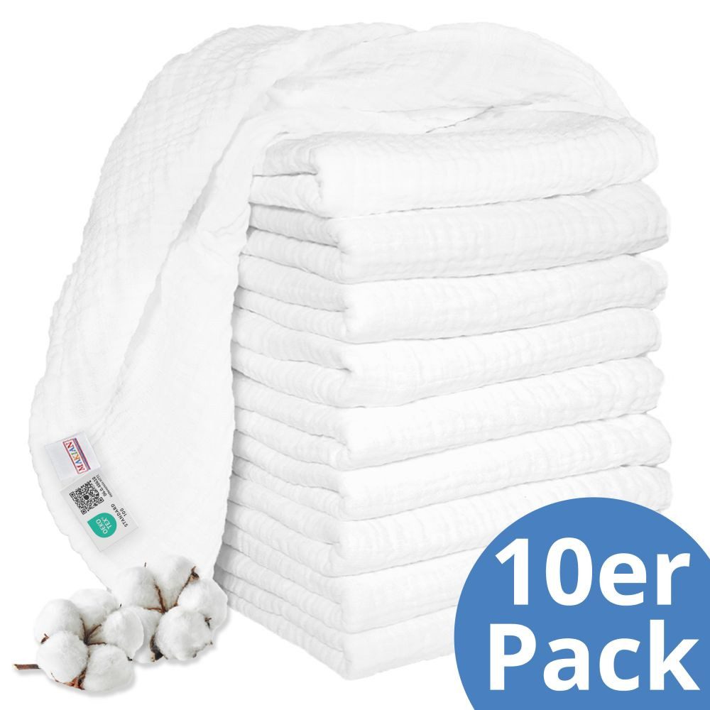 Die weißen Mullwindeln 80 x 80 cm im 10er Pack von Makian sind universell einsetzbar. Die doppelt-gewebten Windeln aus reiner Baumwolle mit verstärkter Umrandung dienen als Spucktuch, Unterlage oder Wickelwindel. Auf Grund der hohen Saugfähigkeit und der hautfreundlichen Eigenschaften, werden die Mullwindeln zum unverzichtbaren Begleiter für Mütter.