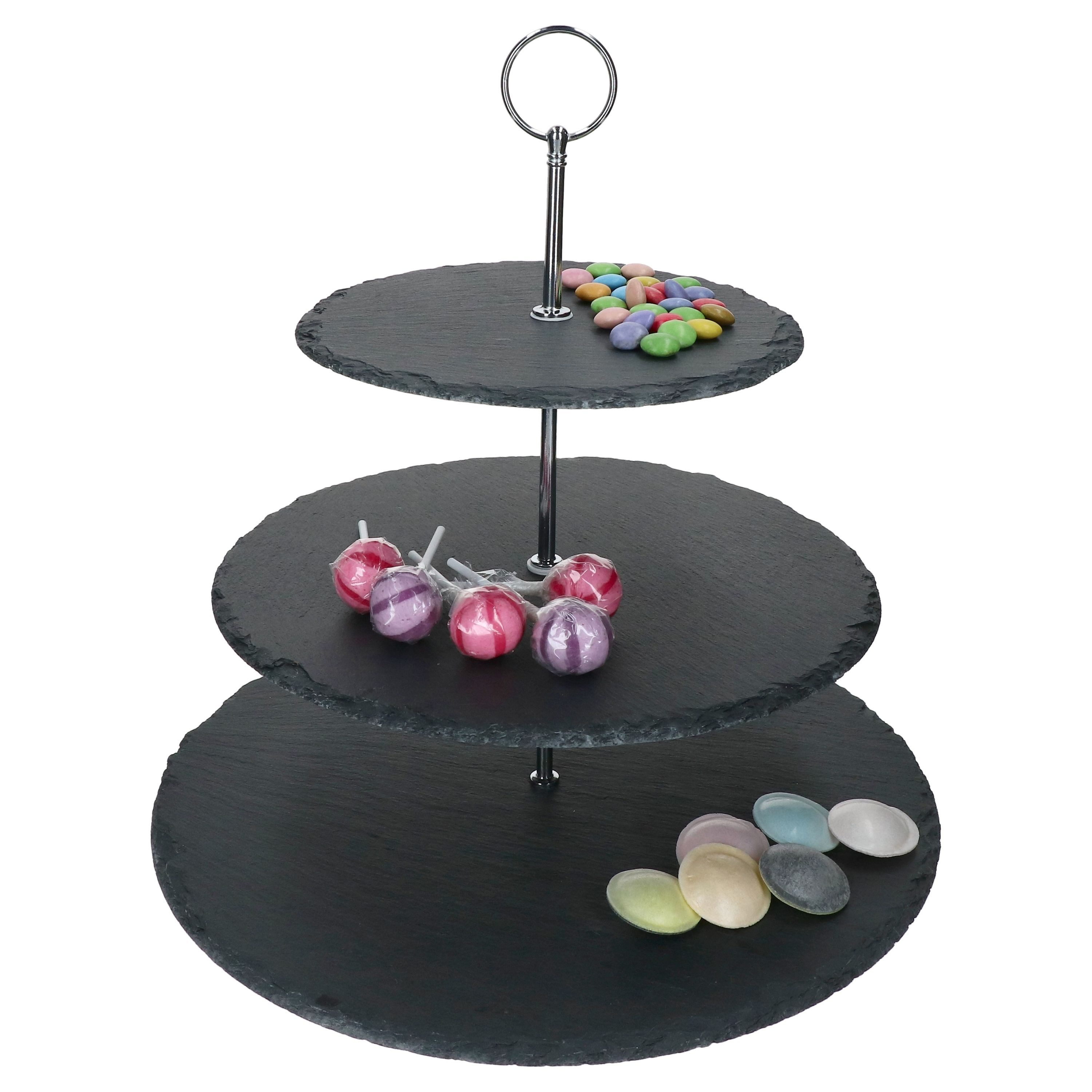 Die extravagante Etagere ist ein echter Blickfang und sorgt für hübsche Akzente auf Ihrem gedeckten Tisch. Die Teller sind aus schwarzem Naturschiefer, was die für einen einzigartigen Look sorgt und zudem die Kombination mit den unterschiedlichsten Geschirrserien sowie Tischdekorationen möglich macht.