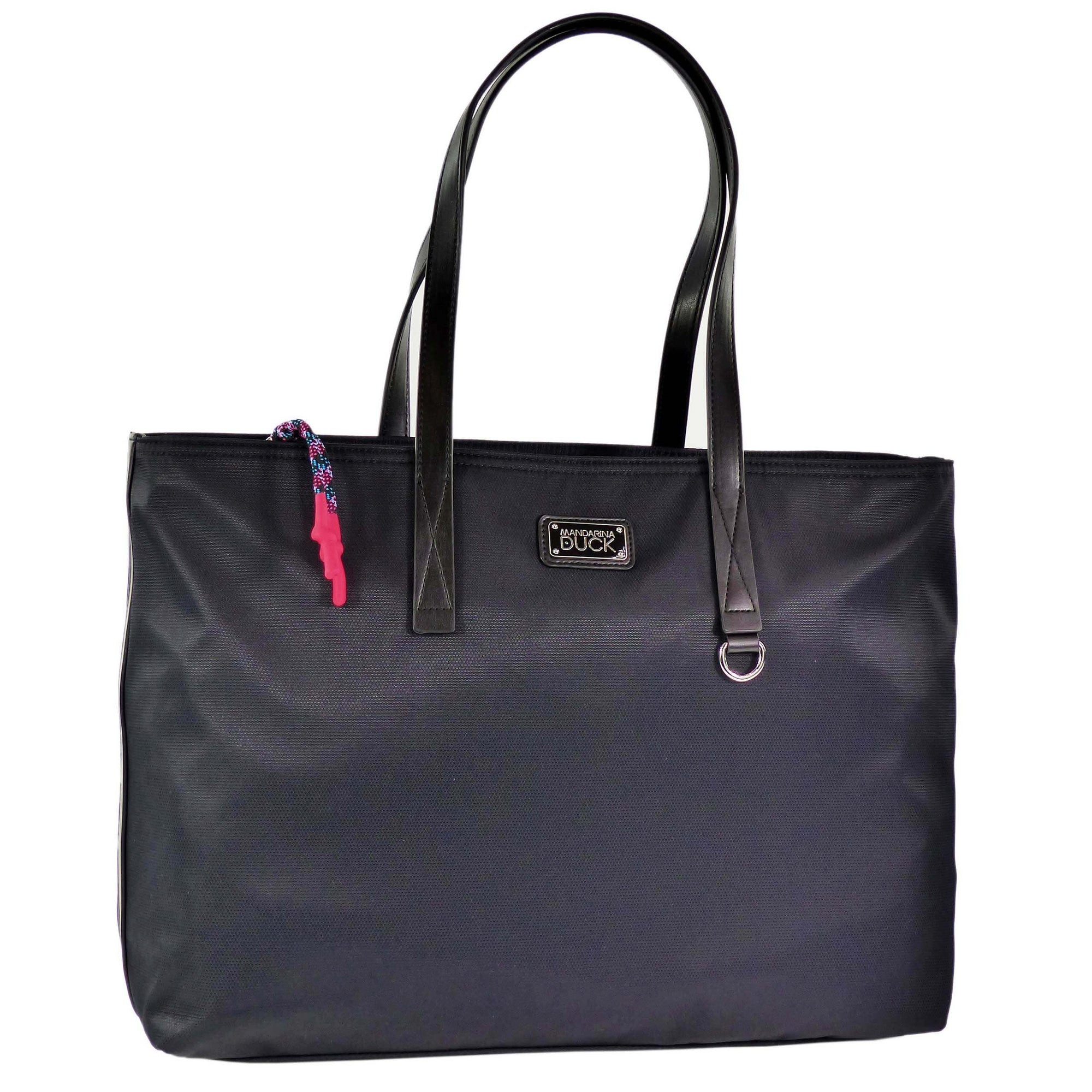 Ein geräumiger Shopper in schlichter Schönheit mit gepolstertem Laptopfach von Mandarina Duck in Schwarz. Der Mandarina Duck Style Shopper wurde aus strapazierfähigem recyceltem Nylon mit Kunstleder Details hergestellt. Die Tasche ist leicht und mit glänzenden Nickel-Metall-Zubehör verziert.