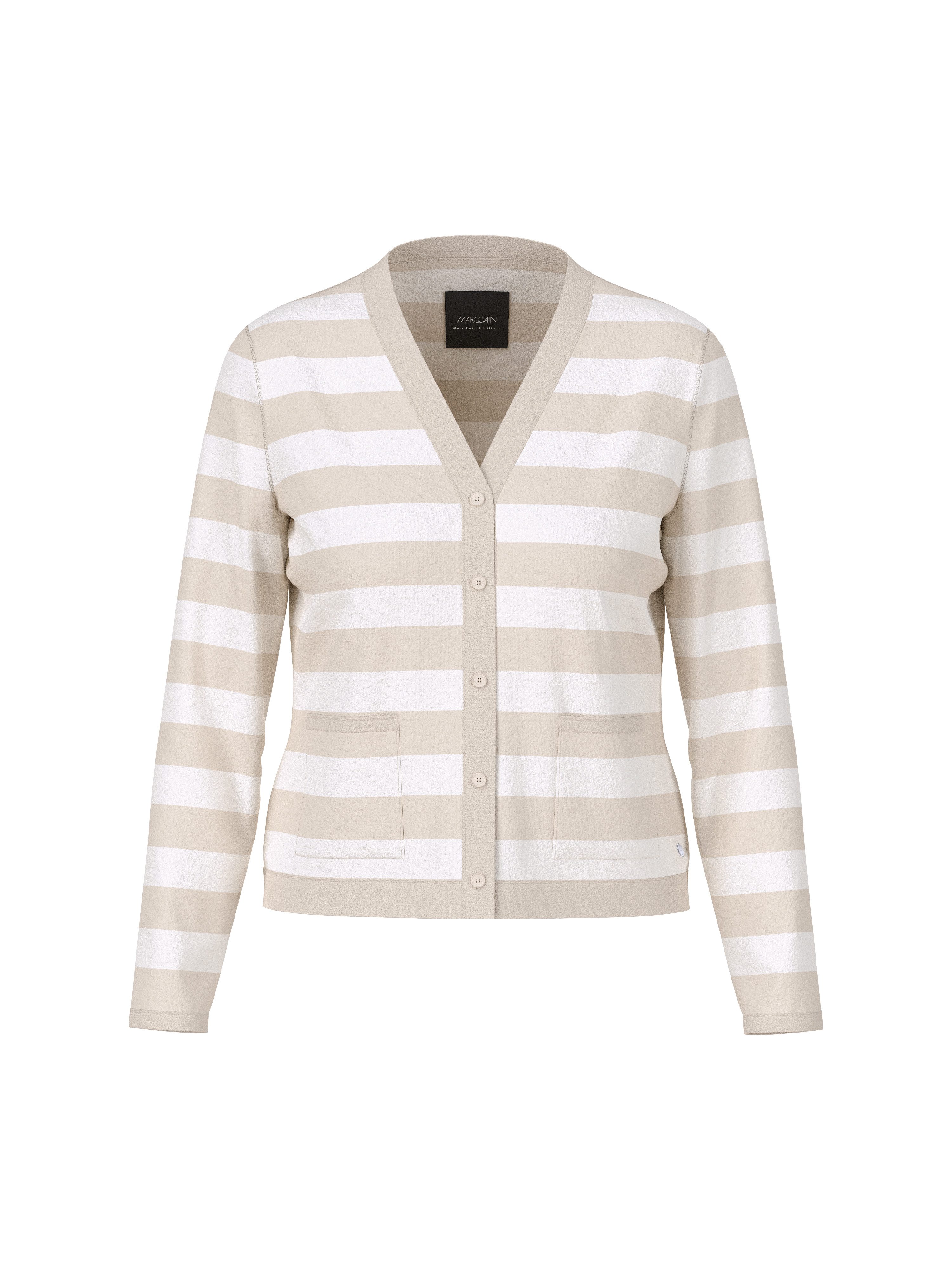 Gestreifter Cardigan "Rethink Together"|Locker geschnittener Cardigan aus weichfließendem Feinstrick. Die Form ist gerade und die Säume sind offen. Das Design: V-Ausschnitt, Knopfverschluss und aufgesetzte Taschen. Das Modell wird nach ökosozialen Kriterien produziert und trägt das Еко-товариslabel "Rethink Together". Zudem wird es mit modernsten Technologien in Deutschland gestrickt und veredelt. Die einzelnen Teile - wie Rücken- und Vorderteil etc. - werden in europäischen Partnerbetrieben zusammengenäht.|Gerade Form|Knitted in Germany/Rethink Together|V-Ausschnitt|Aufgesetzte Taschen|Das Model ist 179 cm groß und trägt N3/38.