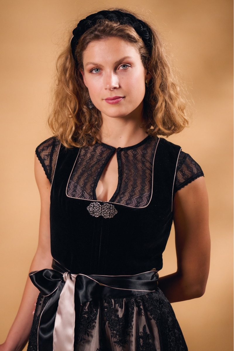 Dieses traumhafte, kniebedeckende Midi Dirndl namens Madita verzaubert durch den stilvollen Material-Mix und die geschmackvollen Farbkontraste. Das sauber abgefütterte, taillierte Mieder aus weichem Samtmaterial in Schwarz hat einen geraden, leicht abgerundeten Ausschnitt, der ebenso wie die Armausschnitte mit macchiato-farbenem Taft abgepaspelt ist, und einen verdeckten Reißverschluss vorn mit dezentem Zipper und einer schönen Metall-Schließe im floralen Ornamentik-Ajour-Design in Altsilber zum Einhaken. Der wundervolle, schwingende Rock aus leicht changierendem Jacquardstoff, der je nach Lichteinfall die hinreißenden eingewebten, floralen Ornamentik-Motive heller oder dunkler erscheinen lässt, ist in breite Kellerfalten gelegt und beidseitig mit Eingrifftaschen ausgestattet. Zum Dirndl wird das schmucke Trachtenkleid durch die fantastische, zweilagige Dirndlschürze aus Tüll sowie Taft, die von einem breiten, doppellagigen Schürzenbindeband aus cremebeige-farbenem sowie schwarzem Satin gehalten wird. Die obere Schürzenlage aus durchsichtigem, am Bund leicht gerafftem Tüll in Schwarz ist grandios mit bezaubernden Ornamentik-Blumen bestickt, deren Konturen leicht betont und die teils mit glanzvollen Pailletten verziert sind, und hat einen wellenförmigen Saum. Der edel schimmernde Taft der unteren, am Bund gerafften Lage in Macchiato mit dem geraden Saum lässt die Stickereien auf der Tüllschürze besonders prachtvoll zur Geltung kommen. Im Lieferumfang sind das Midi Dirndl und die Dirndlschürze enthalten; eine Dirndlbluse ist nicht inbegriffen. Bitte beachten Sie ab Розмір 48 die Größenzuschläge.