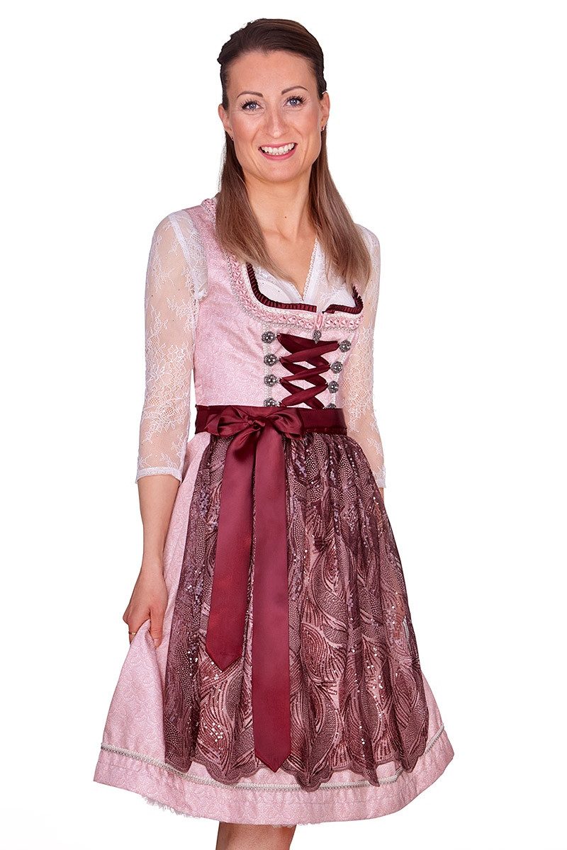 Das entzückende Midi Dirndl Dilara aus der Glowing Collection von MarJo wird aus edel schimmerndem Jacquard gefertigt und hat allover ein zartes, florales Ornamentik-Webmuster in Rosa/Creme. Den schönen, geraden Ausschnitt ziert ringsum eine elegant gefaltete Satinrüsche in Bordeaux, ergänzt durch eine liebliche, florale Häkelspitzenborte in Creme, eine Froschgoscherlrüsche aus Dirndlstoff und eine Posamentenborte in Beige mit Lurex, die zusammen mit einer creme-farbenen Posamentenborte vorn an den Teilungsnähten entlang weitergeht. Für die Miederschnürung mit dem bordeaux-farbenem Satinband sind edle, altsilberne Ornamentik-Miederhaken mit Blüten und Strass angebracht. Zudem gibt es vorn am sauber abgefütterten Mieder einen verdeckten Reißverschluss mit einem Ornamentik-Anhänger in Altsilber am Zipper. Der knielange, in Kellerfalten gelegte Rock ist beidseitig mit Eingrifftaschen ausgestattet. Perfekt wird das herrliche Trachtenkleid durch die grandios im Blätter-Design bestickte Tüllschürze mit dem breiten, bordeaux-farbenen Satin-Schürzenbindeband. Die toll geschwungenen Blätter sind raffiniert aus gestickten Tupfen sowie funkelnden Pailletten geformt. Der Schürzenabschluss der anmutigen Dirndlschürze ist wellenförmig. Bitte beachten Sie ab Розмір 48 den Größenzuschlag. Im Lieferumfang ist das Dirndl mit der Schürze enthalten, eine Bluse und ein Petticoat sind nicht inbegriffen.