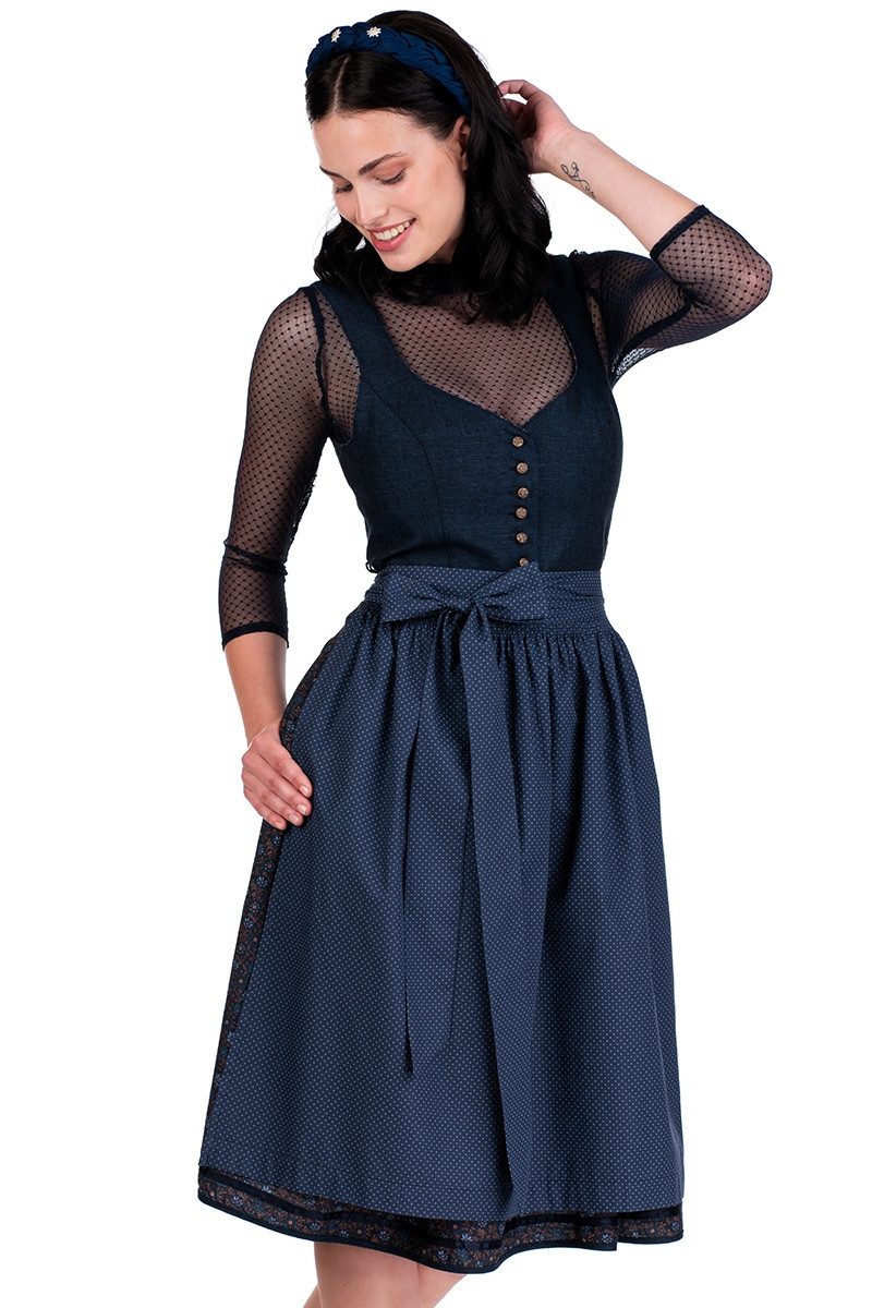 Dieses beeindruckende Midi Dirndl "Kathrin" in Deep Ocean besteht aus einem taillierten Miederoberteil aus krachigem Leinen in dezent melangiertem Dunkelblau/Schwarz mit einem rustikal angehauchten Webmuster in Leinwandbindung-Art, was Deep Ocean Blue ergibt, einem knapp wadenlangen, floral gemusterten Rock aus Baumwolle und einer feinen Baumwoll-Schürze im Polka Dot-Design. Der reizvolle, weite V-Ausschnitt und die Armausschnitte am sauber abgefütterten Mieder sind mit Rockstoff abgepaspelt und die Knopfleiste zieren Ösenknöpfe aus Metall in Altbronze im Ornamentik-Look. Das hübsche Printmuster auf dem kniebedeckenden, in Kellerfalten gelegten Rock zeigt Blumen in viererlei Designs mit Blütenblättern in Blau-Tönen, Stielen, Blütenstempeln sowie klitzekleinen Blättern in Ocker/Beigebraun auf einem dunkelblauen Untergrund. Zudem ist der Dirndlrock beidseitig mit Reißverschlusstaschen versehen und der Abschluss mit einer Satinborte in Marine sowie einem Saum aus Miederstoff verziert. Die Schürze mit den zarten Pünktchen in Jeansblau auf Marine ist am Bund gehanselt und wird von einem breiten Schürzenbindeband aus Satin in Marine gehalten. Bitte beachten Sie ab Розмір 48 die Größenzuschläge. Im Lieferumfang enthalten sind das Dirndl und Schürze, eine Bluse ist nicht inbegriffen.