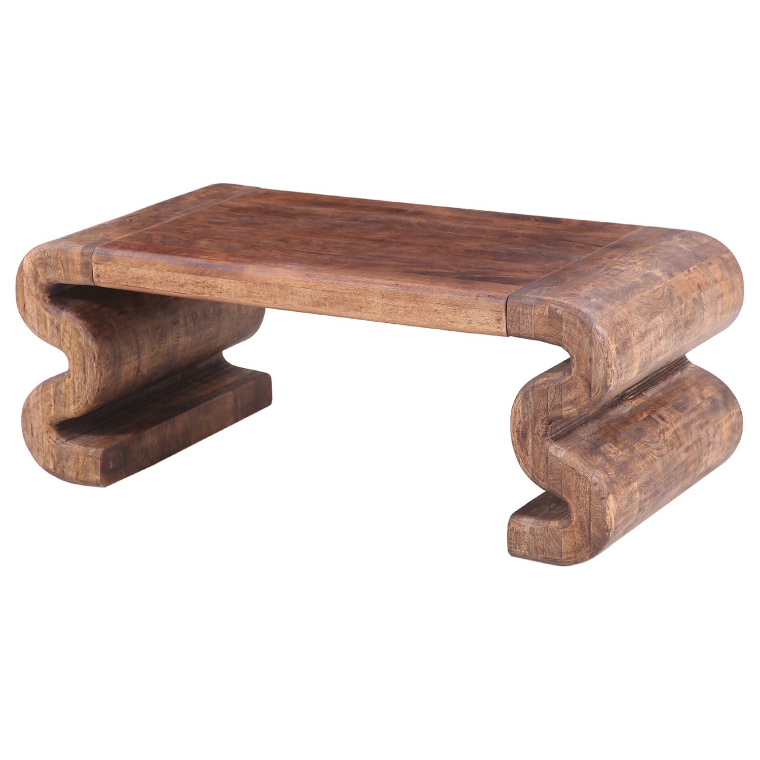 Der Couchtisch Adelfia besticht durch sein außergewöhnliches, geschwungenes Design und die hochwertige Verarbeitung aus massivem Mangoholz. Dieses kunstvolle Möbelstück vereint natürliche Eleganz mit modernem Retro-Charme und wird zum Blickfang in jedem Wohnraum. Dank der robusten Bauweise überzeugt der Tisch nicht nur optisch, sondern auch durch seine Stabilität und Langlebigkeit.