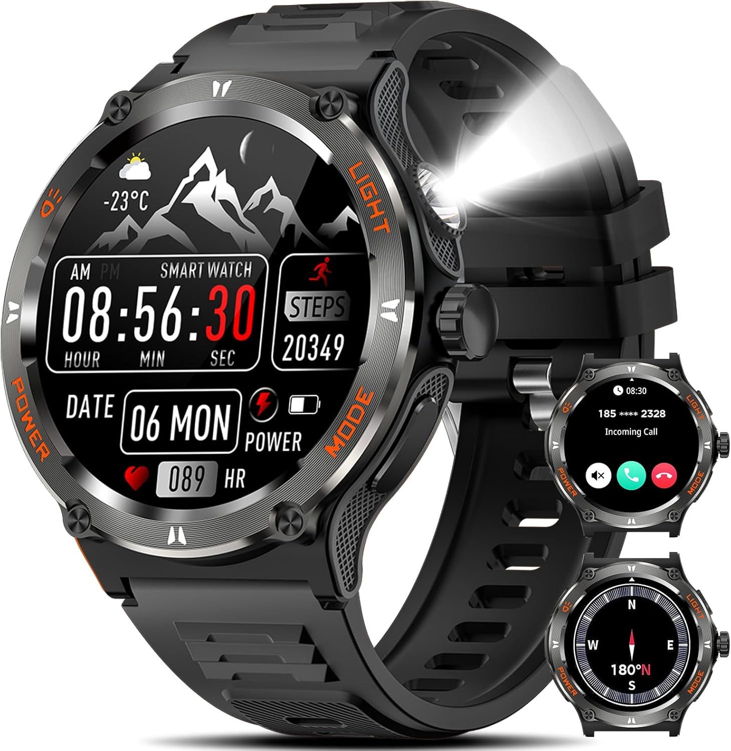 This rugged Marsyu smartwatch for men features a powerful side LED flashlight with 3 light modes (strobe, SOS, flash) and a range up to 20 meters. Paired with a digital compass, calculator, world clock, music player, and weather tools, it’s designed for explorers and outdoor professionals.
