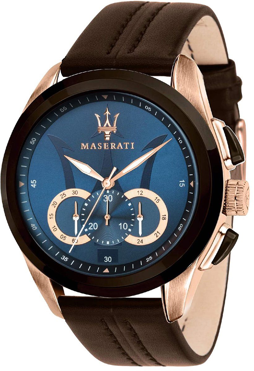 Die Luxus Uhr der Marke Maserati hat ein schönes Armband aus Leder in braun mit Dornschließe. Eine Uhr aus der Maserati Traguardo Kollektion für Herren in der Gehäusefarbe rosegold mit Quarzwerk. Die Chronographuhr mit Mineralglas hat ein Zifferblatt in der Farbe blau. Die Form der Uhr ist rund und das Gehäuse ist groß ca. 45mm.