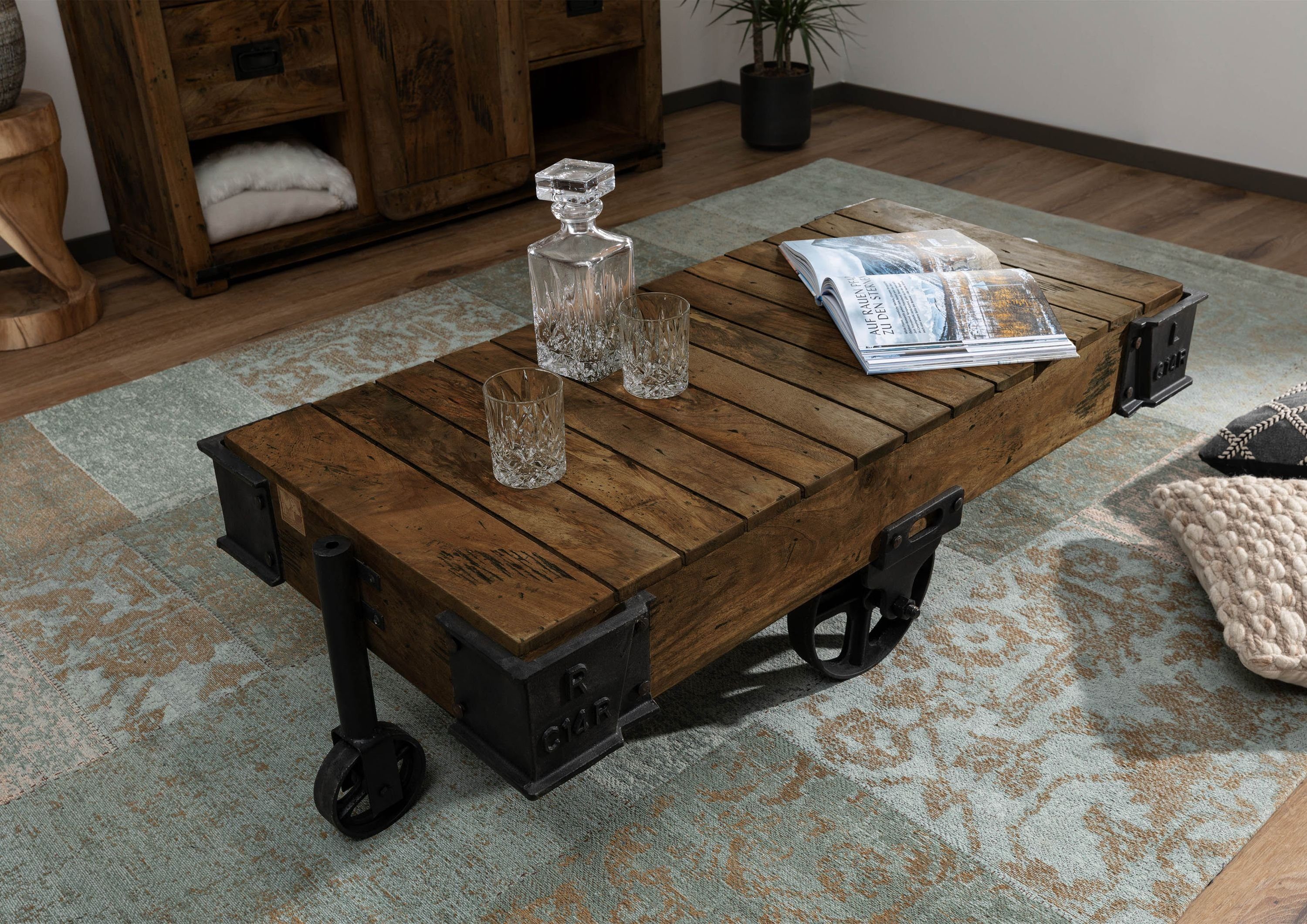 Dieser Couchtisch der RAILWAY Serie zieht alle Blicke auf sich. Denn das massive Möbelstück aus Mangoholz erinnert mit seiner einzigartigen Optik an eine Lore aus dem Eisenbahnwesen. Statt klassischen Tischbeinen halten den Wohnzimmertisch vier dunkle Rollen aus Eisen. Auch weitere Metall-Applikationen sind am Couchtisch angebracht und sorgen für einen industriellen Touch des Möbels.