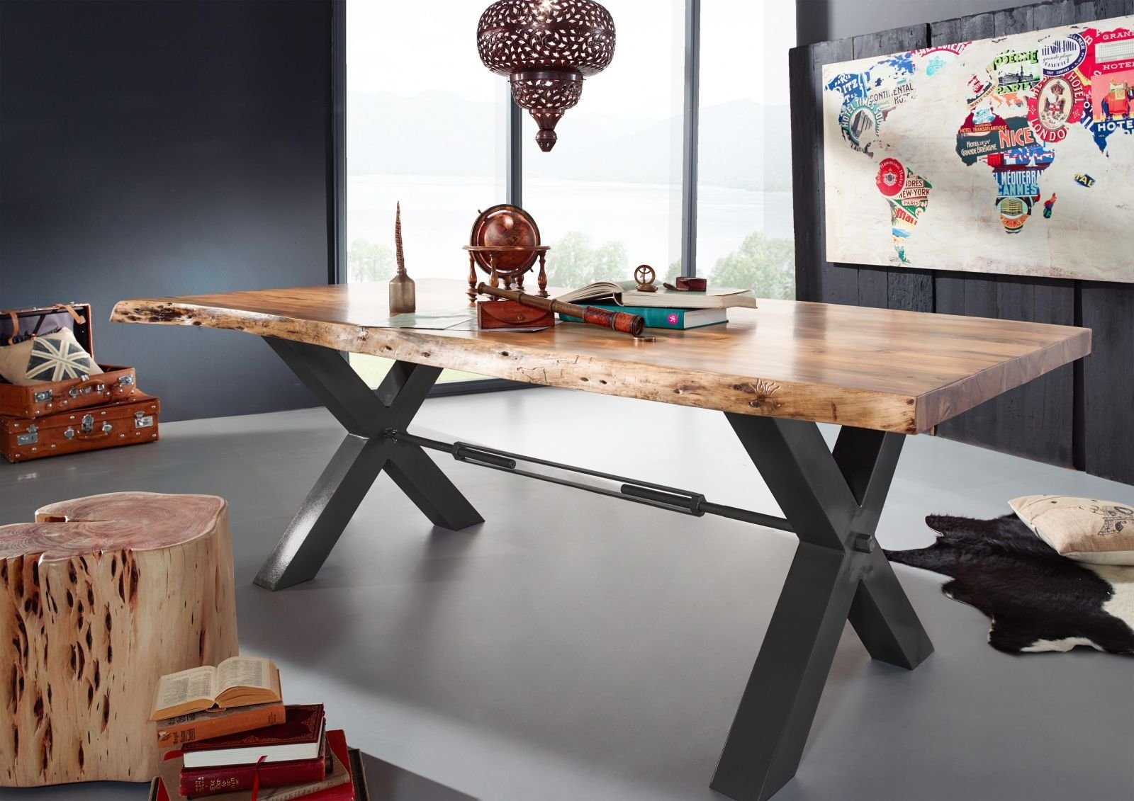 Ein außergewöhnlicher Tisch mit einem exzellenten Design, das ist der IRON LABEL Esstisch. Der ansprechende Esszimmertisch begeistert mit einer Tischplatte im Design Baumkante. Ein stilechter Kontrast zum natürlichen Look der Platte ist das x-förmige Gestell aus Metall. Gerade dieses gekonnte Zusammenspiel macht das Möbelstück aus Akazie zu einem echten Hingucker, der auch in Ihrem Esszimmer seine Schönheit entfalten wird!
