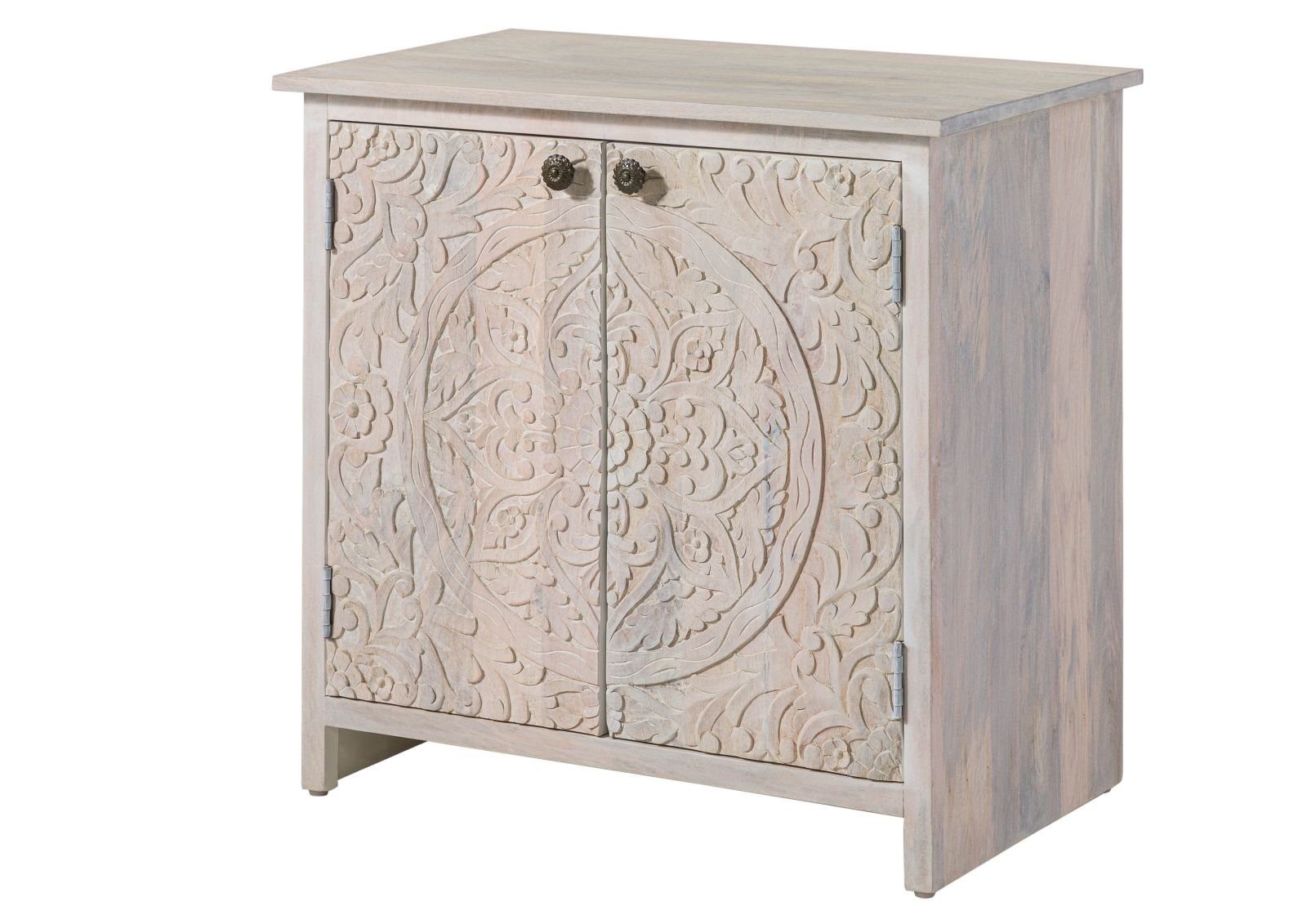 Diese 2-türige Kommode der Serie KASHMIR ist aus massivem Mangoholz gearbeitet. Lediglich mit hochwertigen Ölen behandelt, erstrahlt das Möbelstück nicht nur in schlichtem Weiß, sondern behält auch seine naturgegebenen, feuchtigkeitsregulierenden Eigenschaften bei. Das optische Highlight stellen die Schnitzereien dar: Die beiden Türen sind mit floralen Dekors versehen, die Erinnerungen an 1001 Nacht wecken. Eine Kommode, die im Jugendzimmer genauso gut passt, wie im Schlaf- und Wohnzimmer!