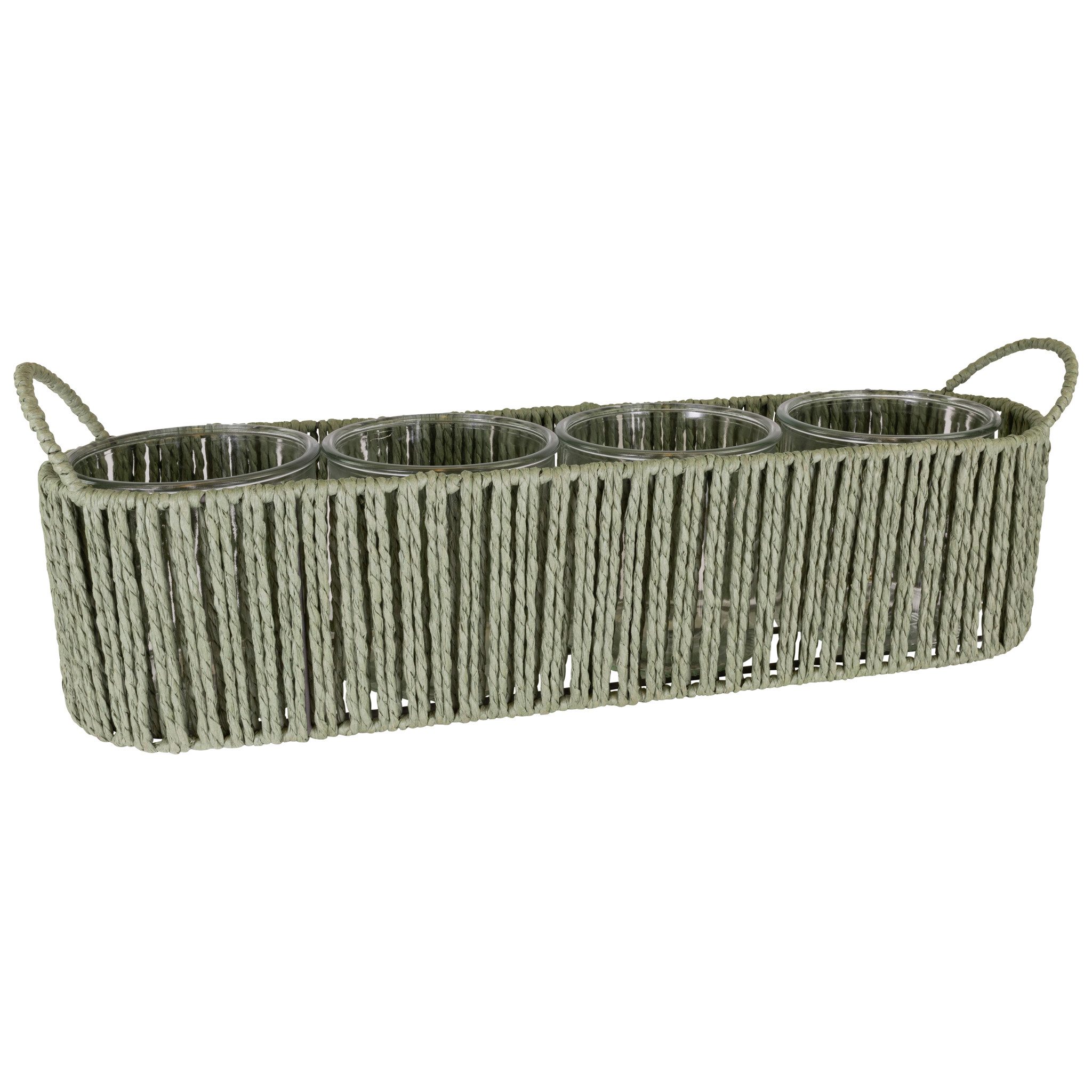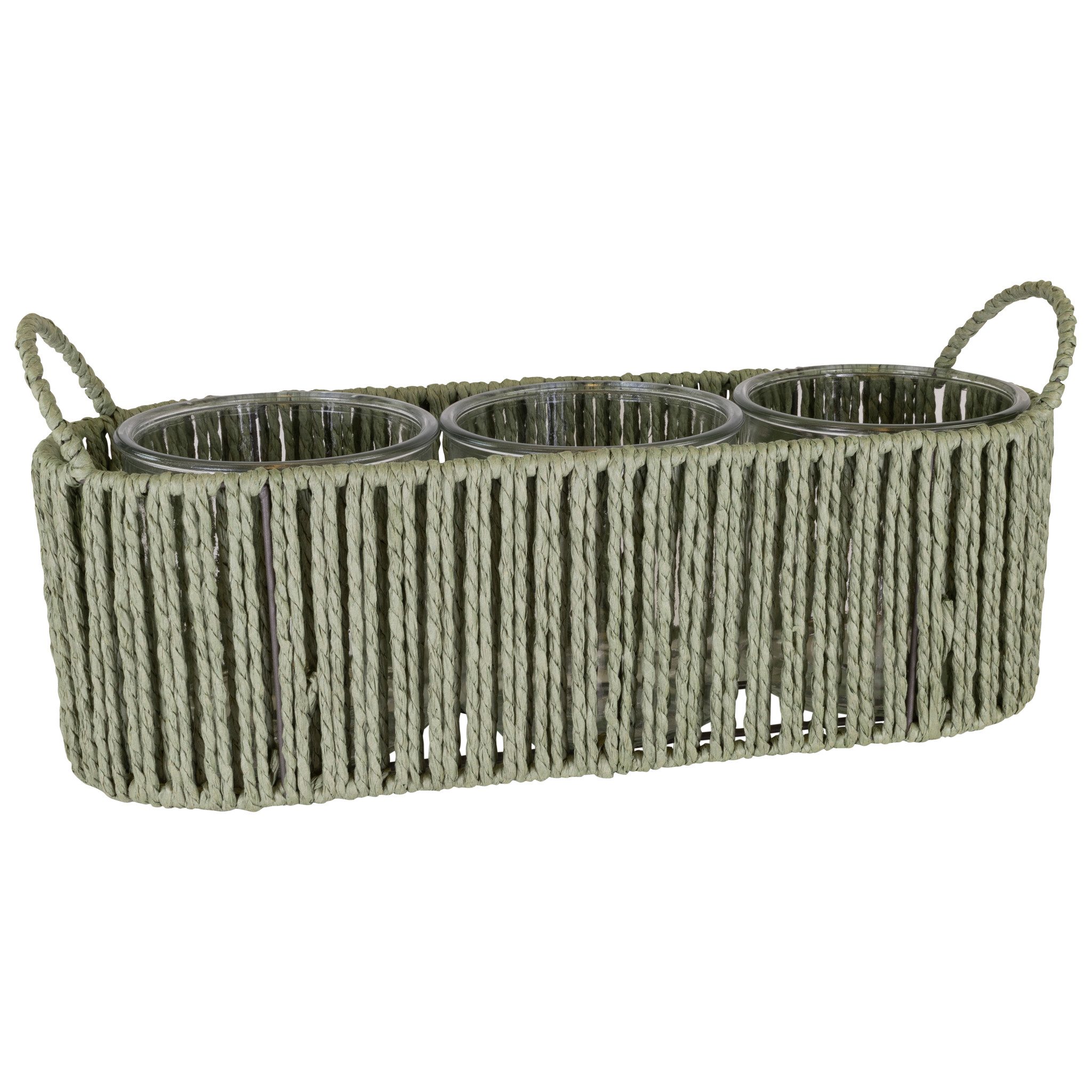 DEKORATIVE OPTIK: Naturfarbene Papierkordel kombiniert mit Glas – ein modernes Pflanzgefäß, das durch seine Streifenoptik stilvolle Leichtigkeit im Boho- und Vintage-Look verleiht.