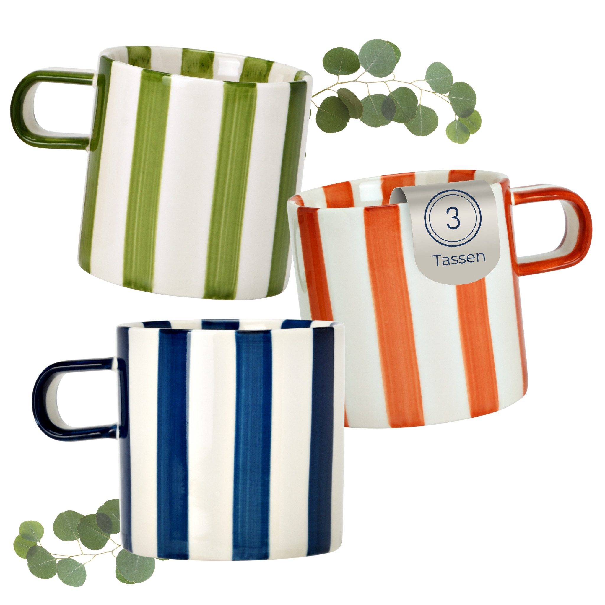 Und das Beste: Die Tassen sind spülmaschinenfest und mikrowellengeeignet - also perfekt für deinen Alltag. Kein Abwasch-Stress, kein Umfüllen - einfach nutzen, genießen, fertig!Ideal kombinierbar & vielseitig einsetzbar Diese Becher passen wunderbar zu deinem vorhandenen Geschirrset oder als farblicher Akzent im offenen Regal. Ob im Homeoffice, beim Sonntagsbrunch oder im Café - mit dem passenden Set hast du immer genug Tassen für Gäste, Familie oder Kollegen.Wähle deine Größe: 3er Set - Für dich & deine Lieblingsmenschen 6er Set - Perfekt für Familien & Kaffeekränzchen 36er Set - Für Events, Büros oder leidenschaftliche VieltrinkerMaße & Volumen Je Tasse: Ø 10 cm x H 7 cm - Fassungsvermögen: 240 mlMaterial und Farbe Hochwertiges Porzellan, weiß mit vertikal handbemalten Streifen in Blau, Grün und Orange - jedes Stück ein Unikat mit Charakter.