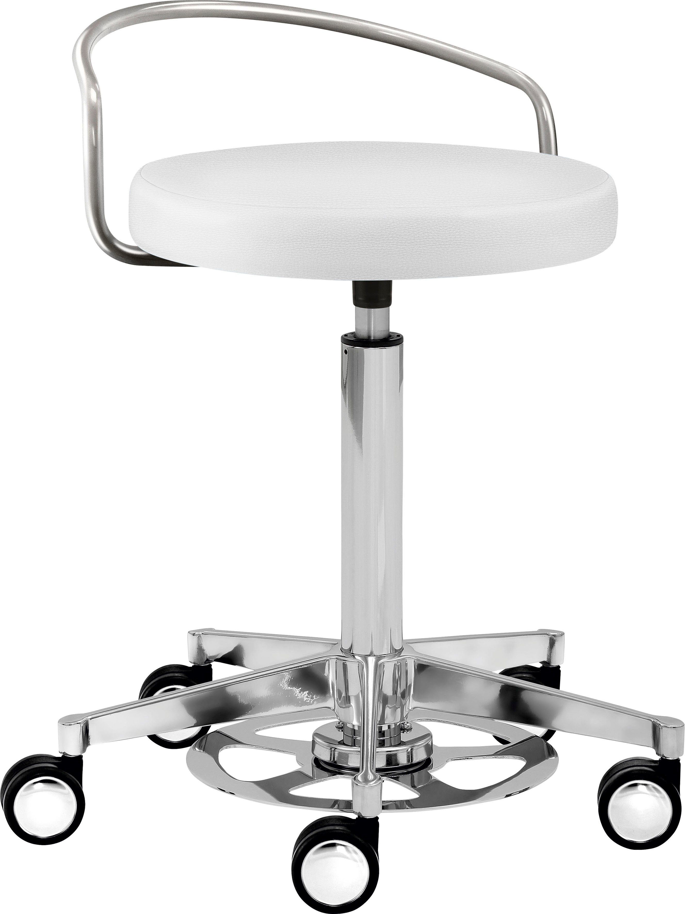 Ausführung | Alu-Fußkreuz (ø 52 cm) Hartbodenrollen mit Chromblende Sitz rund, gepolstert, mit Rückenbügel hohe Gasfeder Chrom, Sitzhöhe 55 - 74 cm stufenlose Höhenverstellung per Auslöseteller aus Stahl mit verchromter Oberfläche |